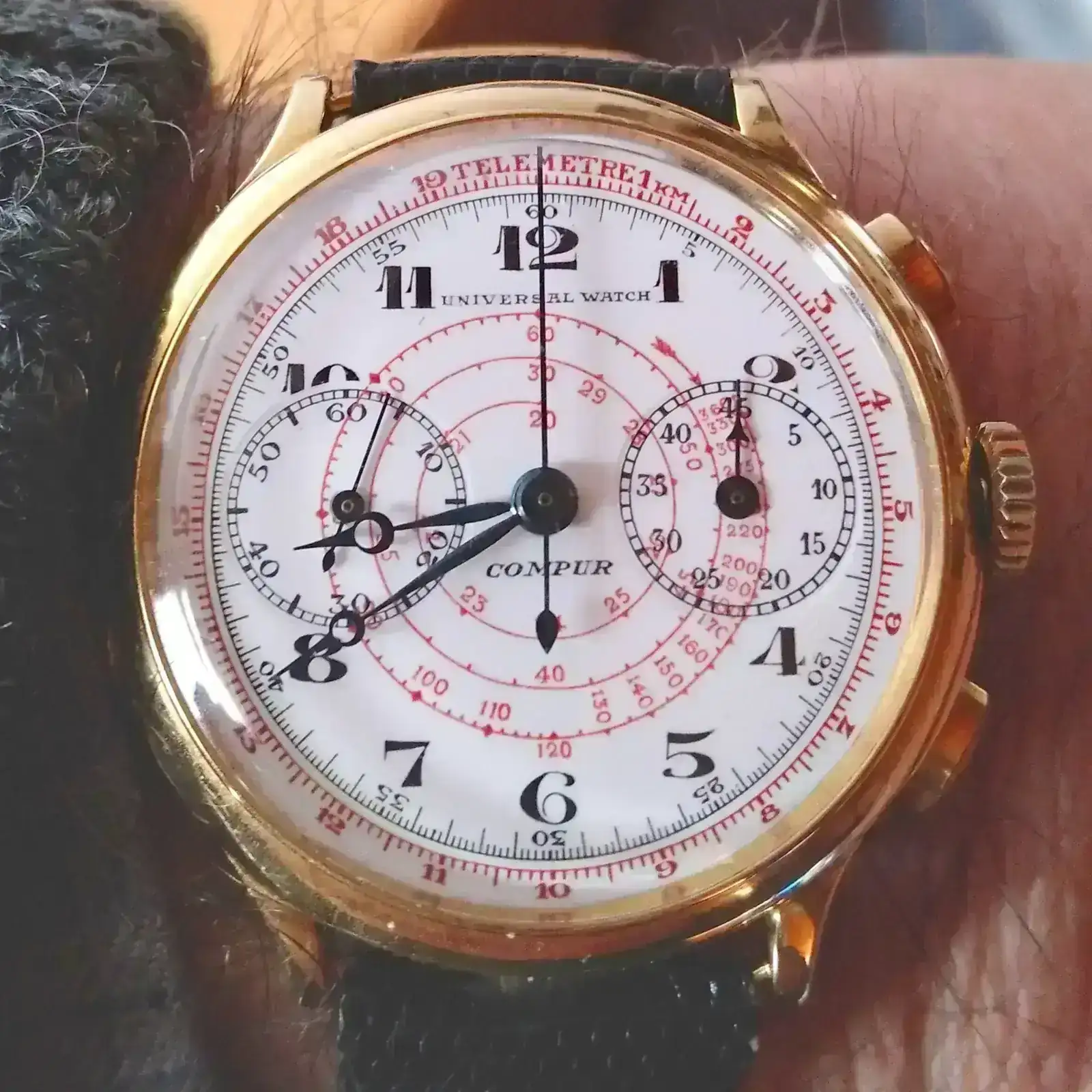 Il raro cronografo Universal Watch “Compur”, 1ª serie, doppia ruota a colonne.