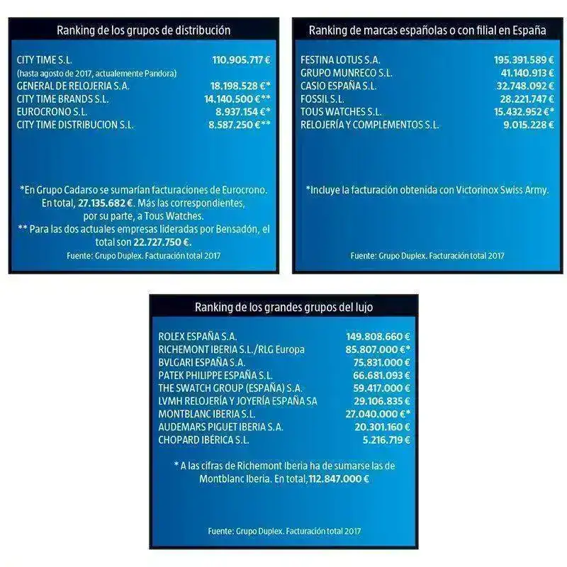 Y en España también está posicionado como número uno, un ejemplo que he encontrado son sus ventas del 2017 con respecto al resto de grupos relojería que vende en nuestro país.