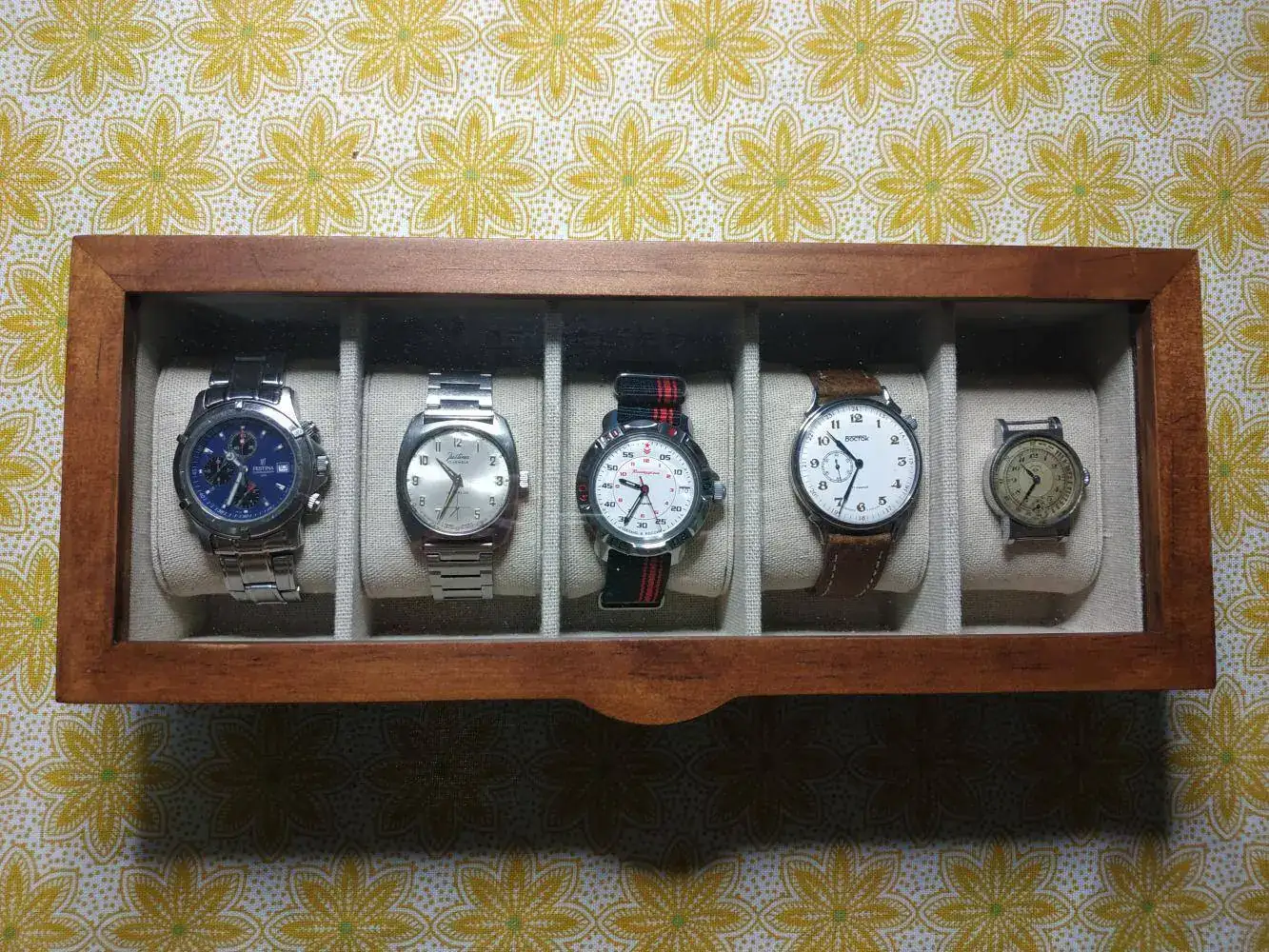 Nótese que la caja ya está llena y no tengo sitio para el Casio, que tengo expuesto en su soporte en el salón. Lo malo es que ahora mido las cosas en Vostoks y me pongo a pensar "¿40€ en una caja? Con eso podría comprar dos Komandirskie...", y creo que la caja dos la necesito ya... porque estoy pujando por un Raketa y a los Reyes Magos les he pedido un Hamilton Khaki Field (ojalá cuele y me lo compre mi señora