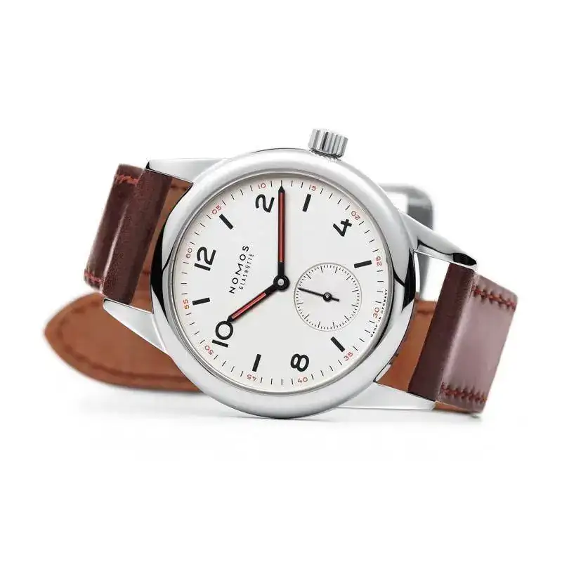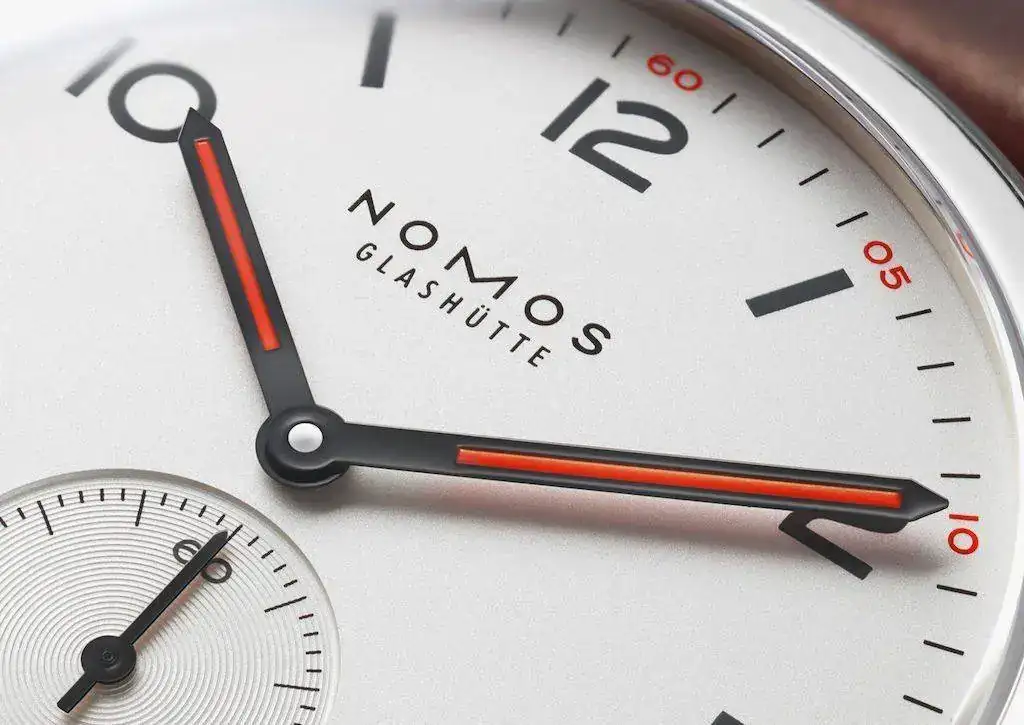El reloj es el NOMOS Club 703 Definitivamente el reloj más “deportivo”de su catálogo, con un bisel un poco más grueso y unas manecillas más anchas delo que normalmente manejan, con un dial crema-blanco-plateado que se combina perfectamente con el naranja y negro de las manecillas y los números impresos sobre el dial.Lo que más me gusta es su versatilidad y tamaño, mide solo 36mm lo cual lo hace muy fácil de llevar además de la combinación de colores que creo lo hacen que puedas ponerlo con absolutamente todo, desde traje en una junta en el trabajo a vaqueros y polo el fin desemana, incluso lo puedes llevar a nadar!!! (10atm).