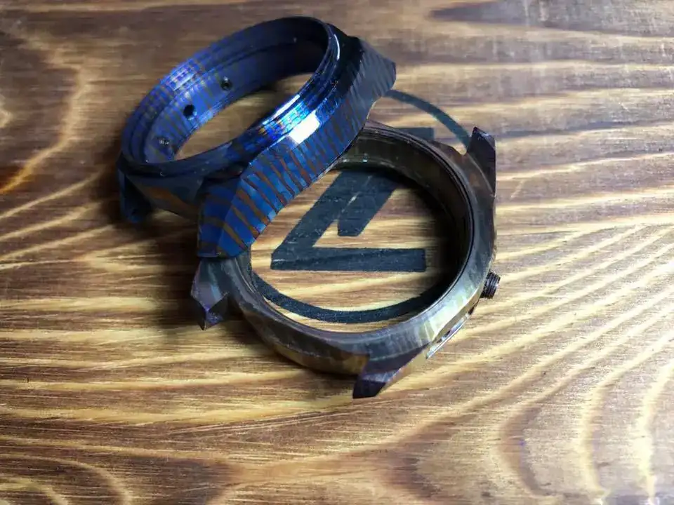 Este material es el resultado de 2 aleaciones diferentes de titanio forjadas bajo gran presion y calor, finalmente lo procesan y calientan a 400°C para lograr esos tonos.