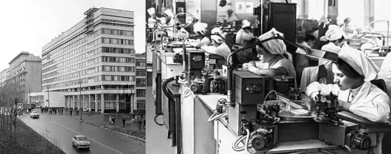 Imágen de la 2ª Fábrica de Relojes de Moscú a finales de la década de los 50. A la derecha un dibujo hecho pasar por fotografía mostrando trabajadoras en una fábrica de relojes. Una técnica habitual de la propaganda soviética de posguerra. Fotografía: https://mak-50.livejournal.com/1543729.html