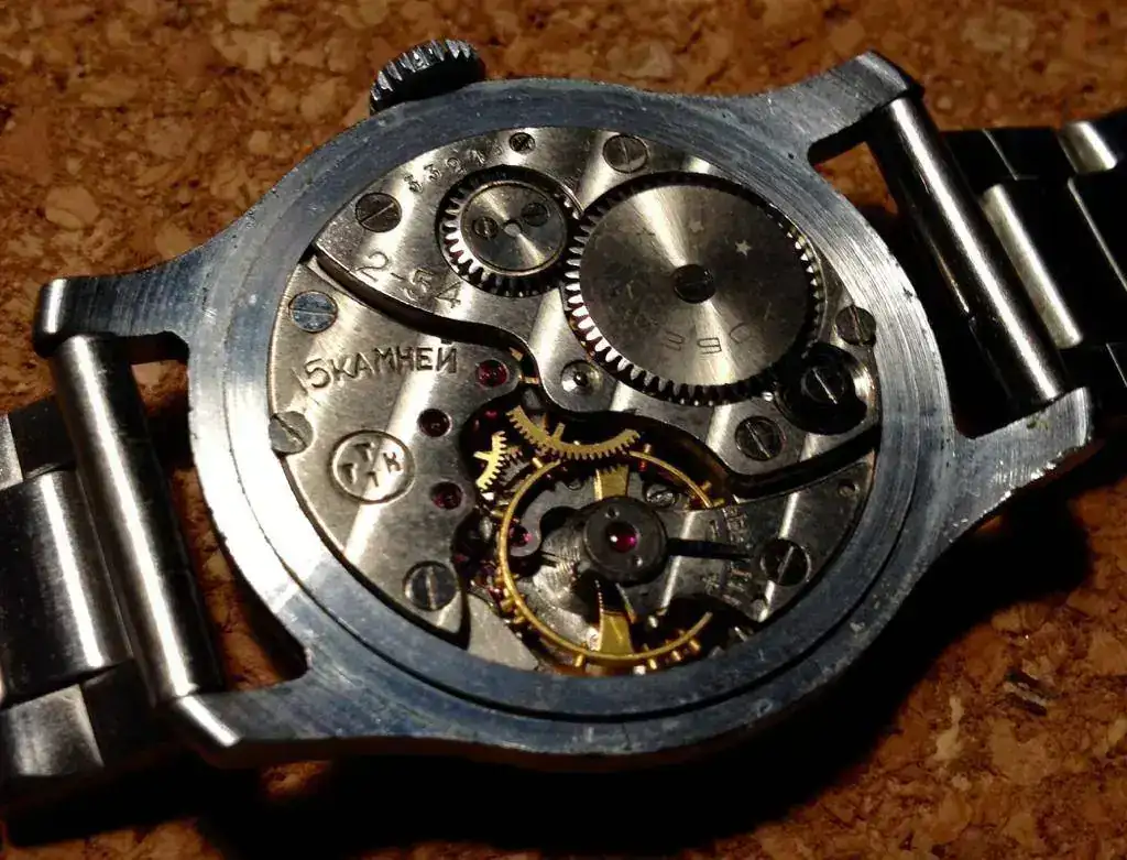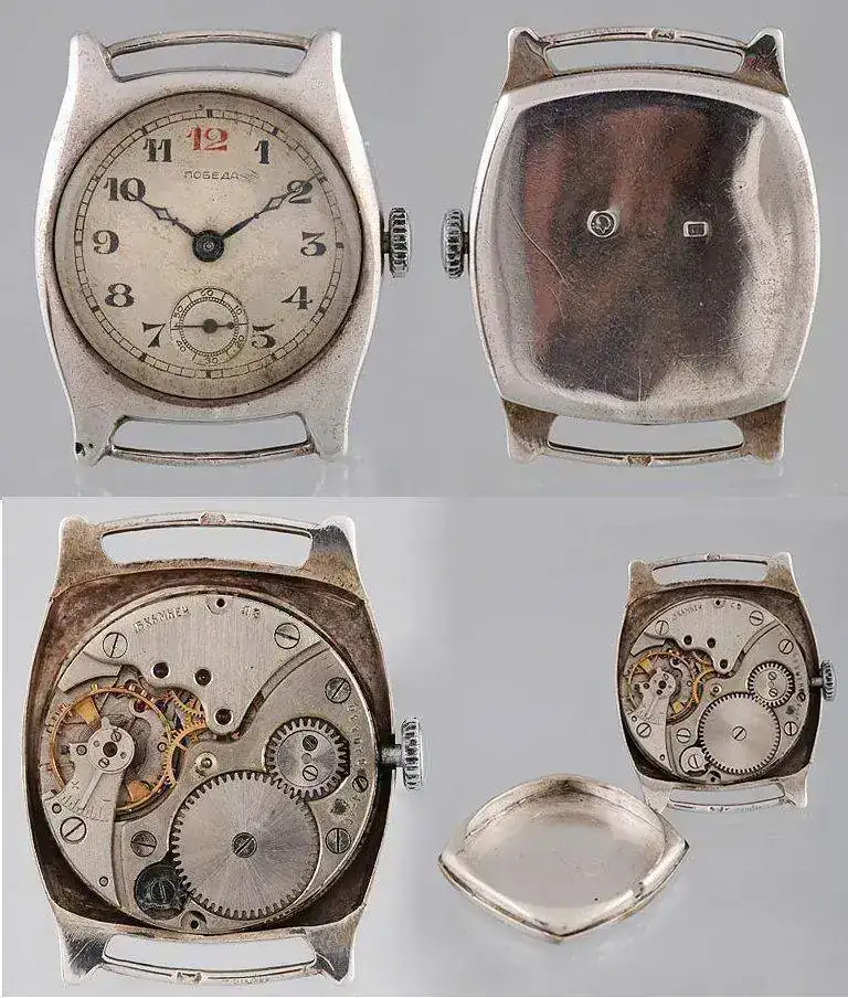 El clásico Pobeda de Penza en caja de plata. El santo grial de los coleccionistas de relojes rusos. El movimiento no lleva ni "côtes de genève" ni grabado el sello de la fábrica. Fotografía: https://back-in-ussr.com/2018/05/istoriya-legendarnyh-chasov-pobeda.html