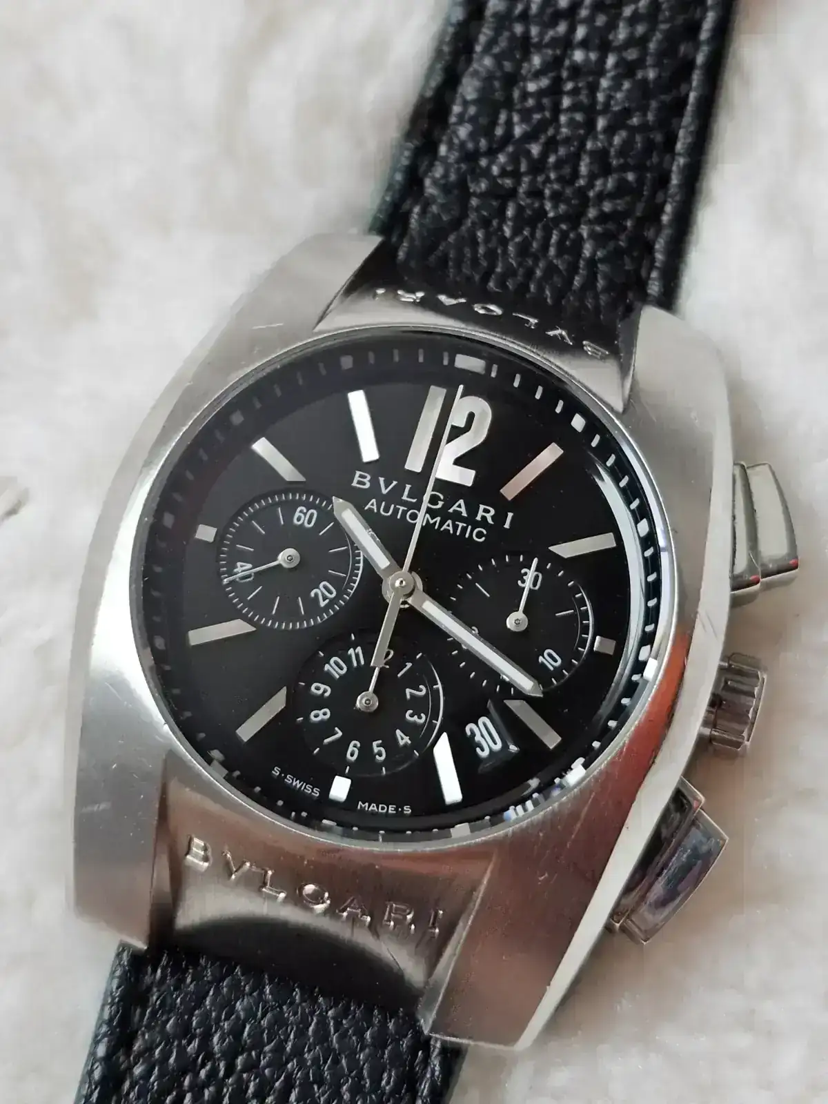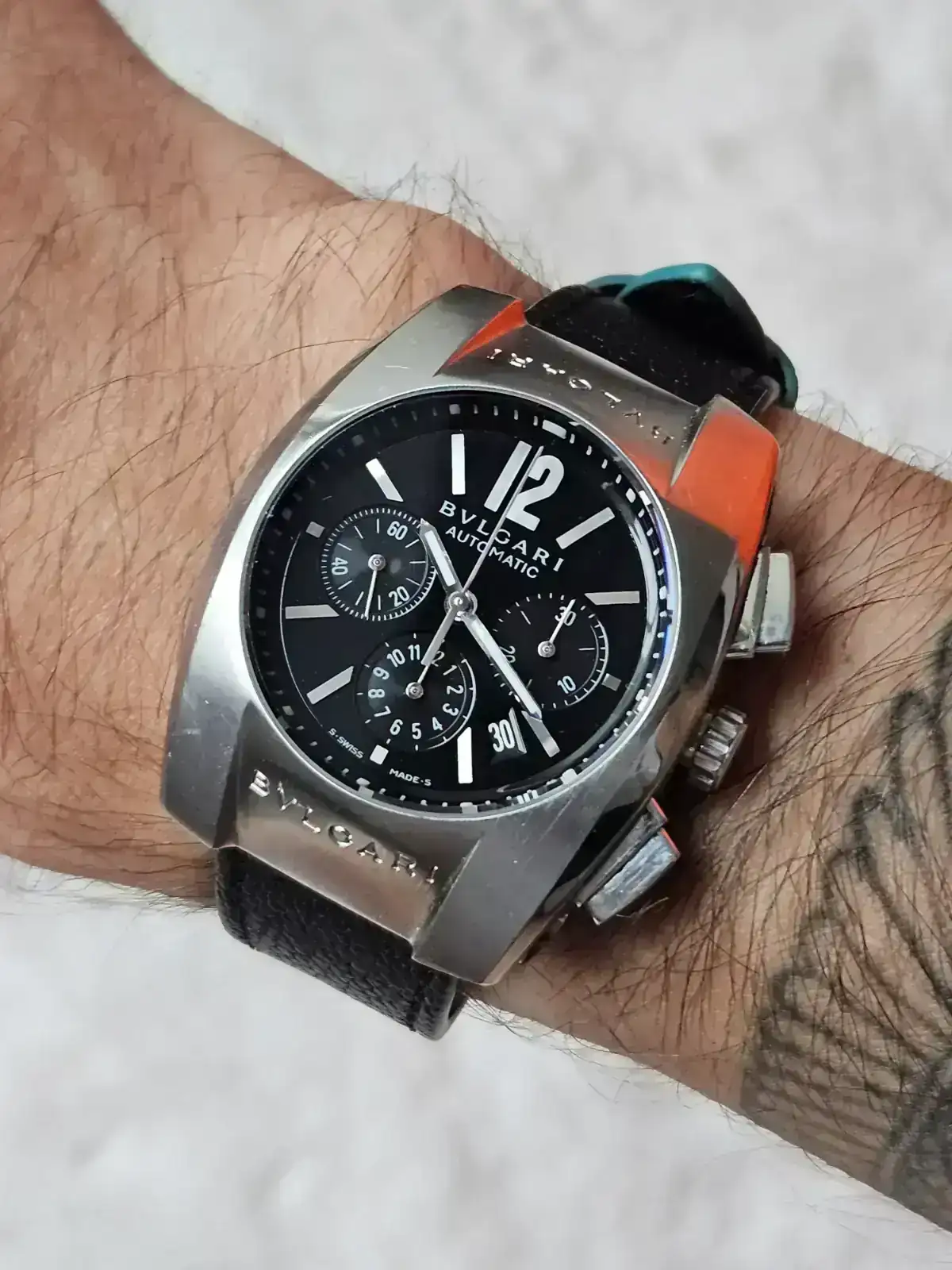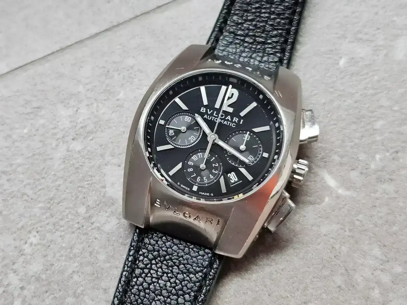 Se trata de un Bulgari Ergon crono. La serie Ergon de principios de los 2000 iba enfocada en la ergonomía, de ahí su nombre. Estaba pensado para llevarse con brazalete o con correas muy específicas.
