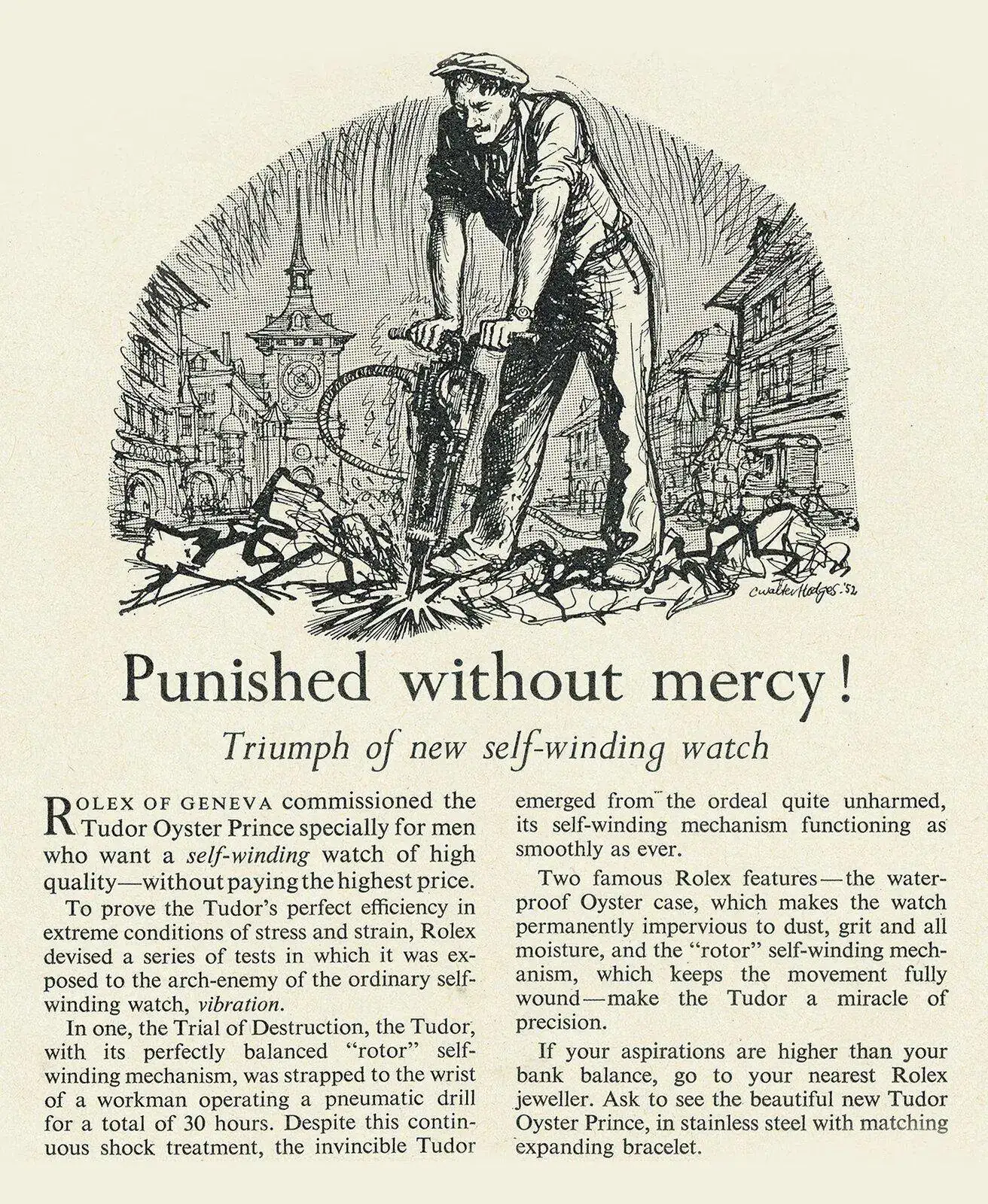 En 1952 se presentó́ finalmente el Tudor Oyster Prince, acompañado de una campaña publicitaria especialmente original y sorprendente para la época. Esta campaña, no se limitaba, como era habitual, a mostrar y describir el producto. En lugar de eso, hacia hincapié́ en sus cualidades de robustez, fiabilidad y precisión en un texto muy detallado, así́ como mediante ilustraciones que mostraban a hombres trabajando en condiciones extremas con un Tudor en la muñeca. Una elección menos convencional que representar actividades deportivas. Estas impactantes imágenes, asociadas a la credibilidad del producto, contribuyeron a conferir a los relojes Tudor un estilo y una personalidad que reflejaban las ideas de modernidad y fiabilidad, trascendiendo mucho más allá́ de los contextos individuales en los que se presentaban.