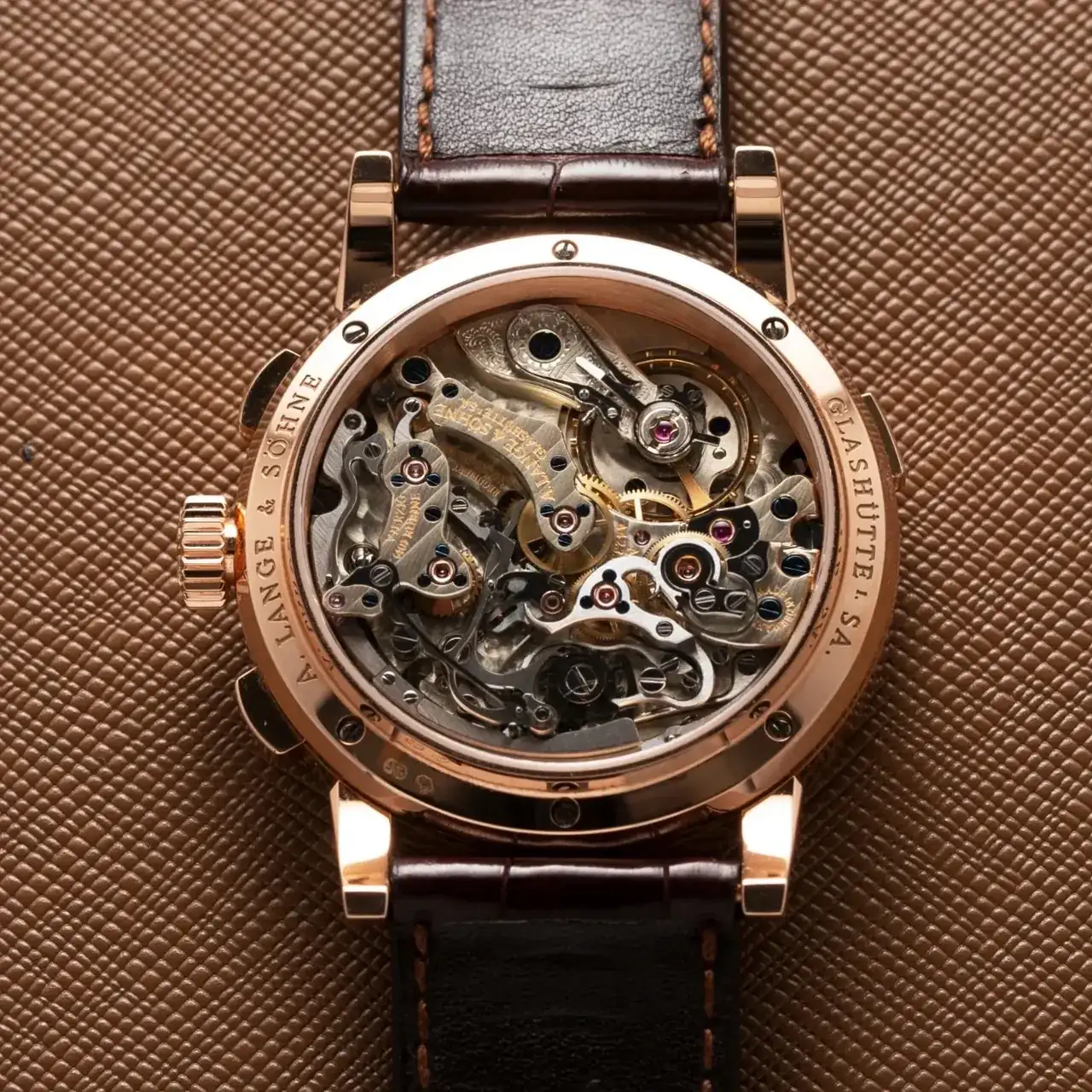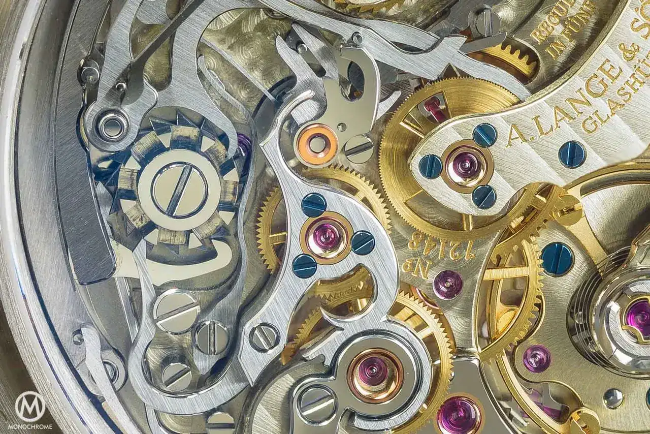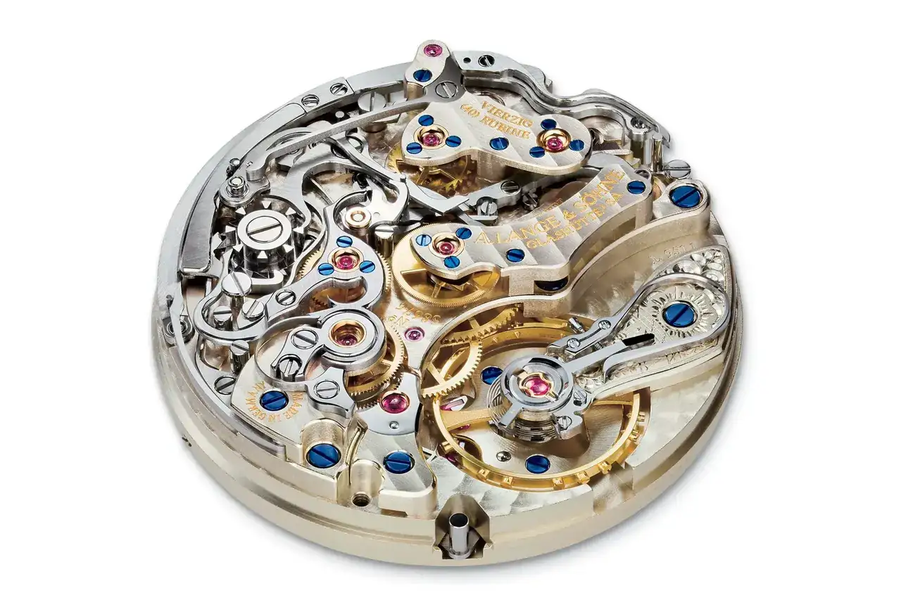 Cuatro años más tarde, A. Lange & Söhne lograron un movimiento notablemente tridimensional y estéticamente agradable compuesto por 405 piezas. Contaba con una rueda de pilares, un embrague lateral, un movimiento de cronógrafo flyback y un contador de minutos que saltaba con precisión, todo ello combinado con una gran función de fecha.