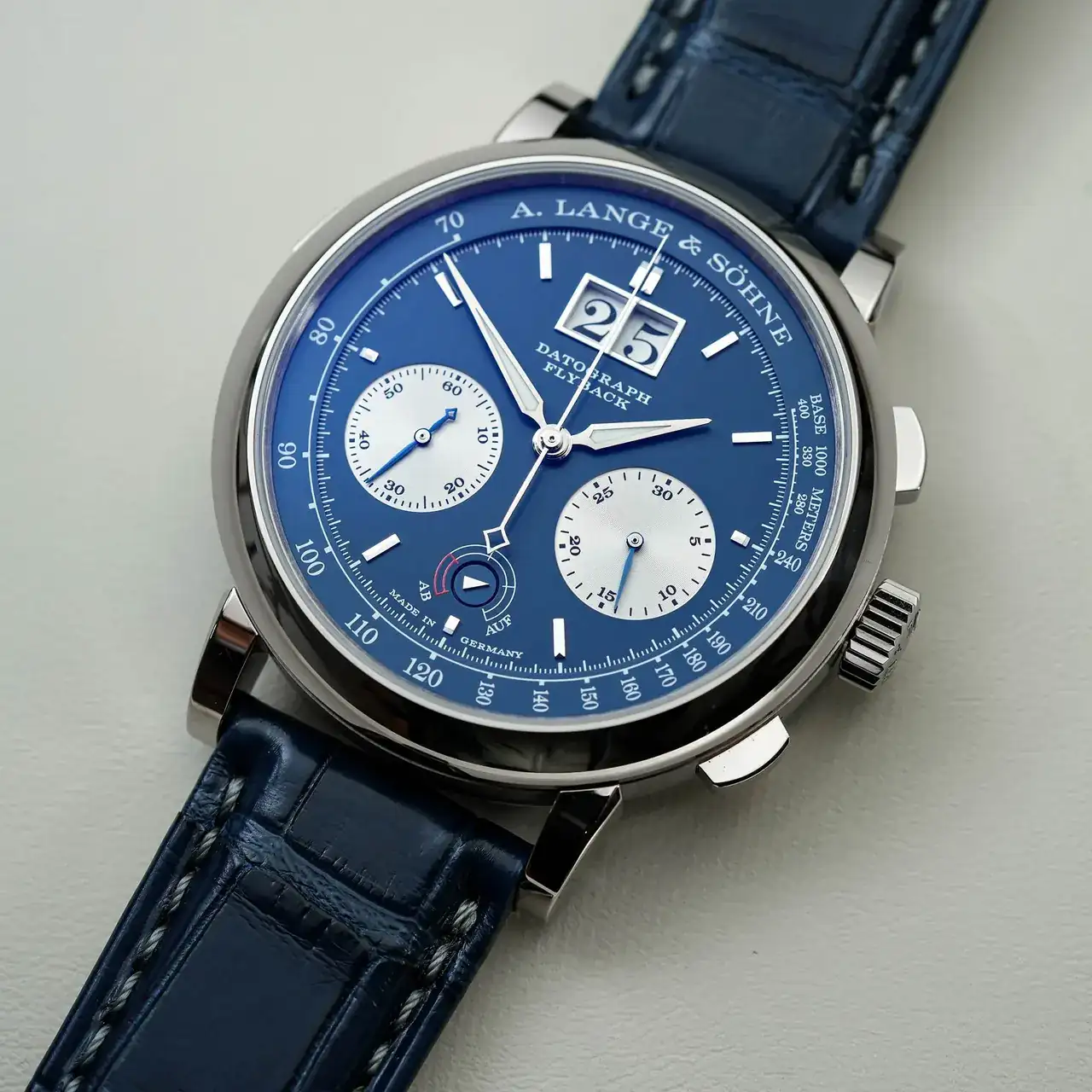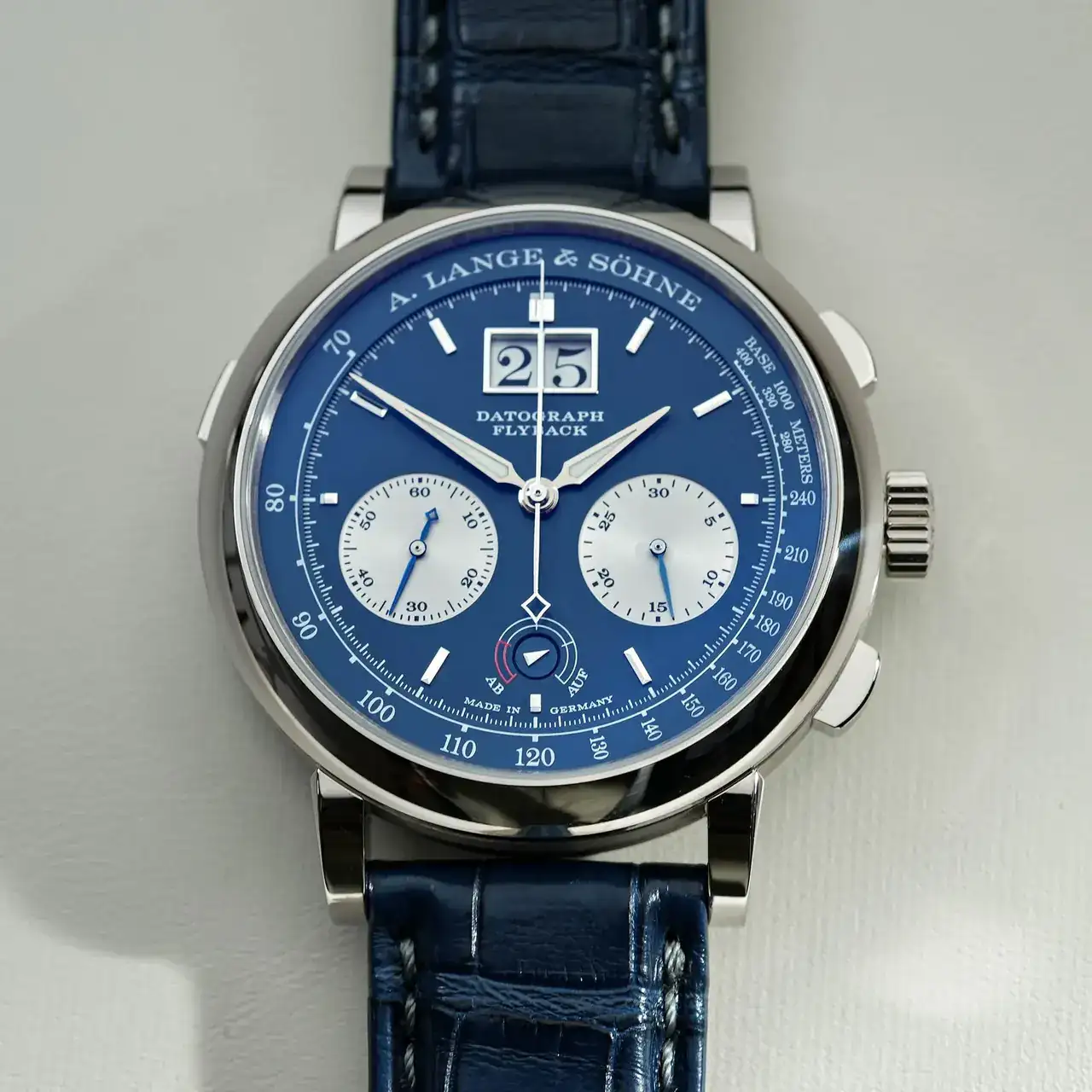 Este modelo en particular, el A. Lange & Söhne Ref. 405.028 es una edición limitada de 125 piezas alojadas en una caja de oro blanco que mide 41 mm de ancho y 13,1 mm de grosor. Cuenta con una corona estriada, dos pulsadores de cronógrafo a las 2 y a las 4 en punto y un pulsador para ajustar rápidamente la indicación de la fecha. La esfera está adornada en azul con subesferas de color rodio. Al igual que sus homólogos de platino y oro rosa, el Datograph Up/Down de aniversario tiene un cronógrafo flyback, un contador de minutos saltantes, la icónica fecha de gran tamaño de dos dígitos y un indicador de reserva de marcha.