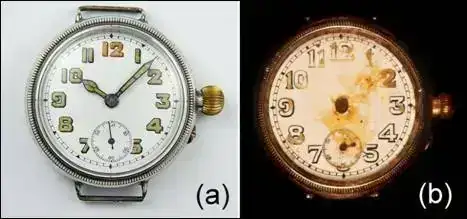 Cuando se halló el reloj, no tenia cristal y las agujas estaban oxidadas, pero ni la caja ni la esfera de esmalte estaban dañadas, ni tampoco había ninguna señal de que el reloj hubiera rozado una roca. El movimiento estaba en buenas condiciones y el volante no estaba dañado a pesar de ser una parte muy delicada del reloj y que en esa época estaba poco protegido, lo que demuestra que no había sufrido daño alguno. Lo unico que hace pensar que el reloj estuviera parado es que las agujas tocaran algo o que se hubieran oxidado juntas y ello hubiera impedido el movimiento de éstas.