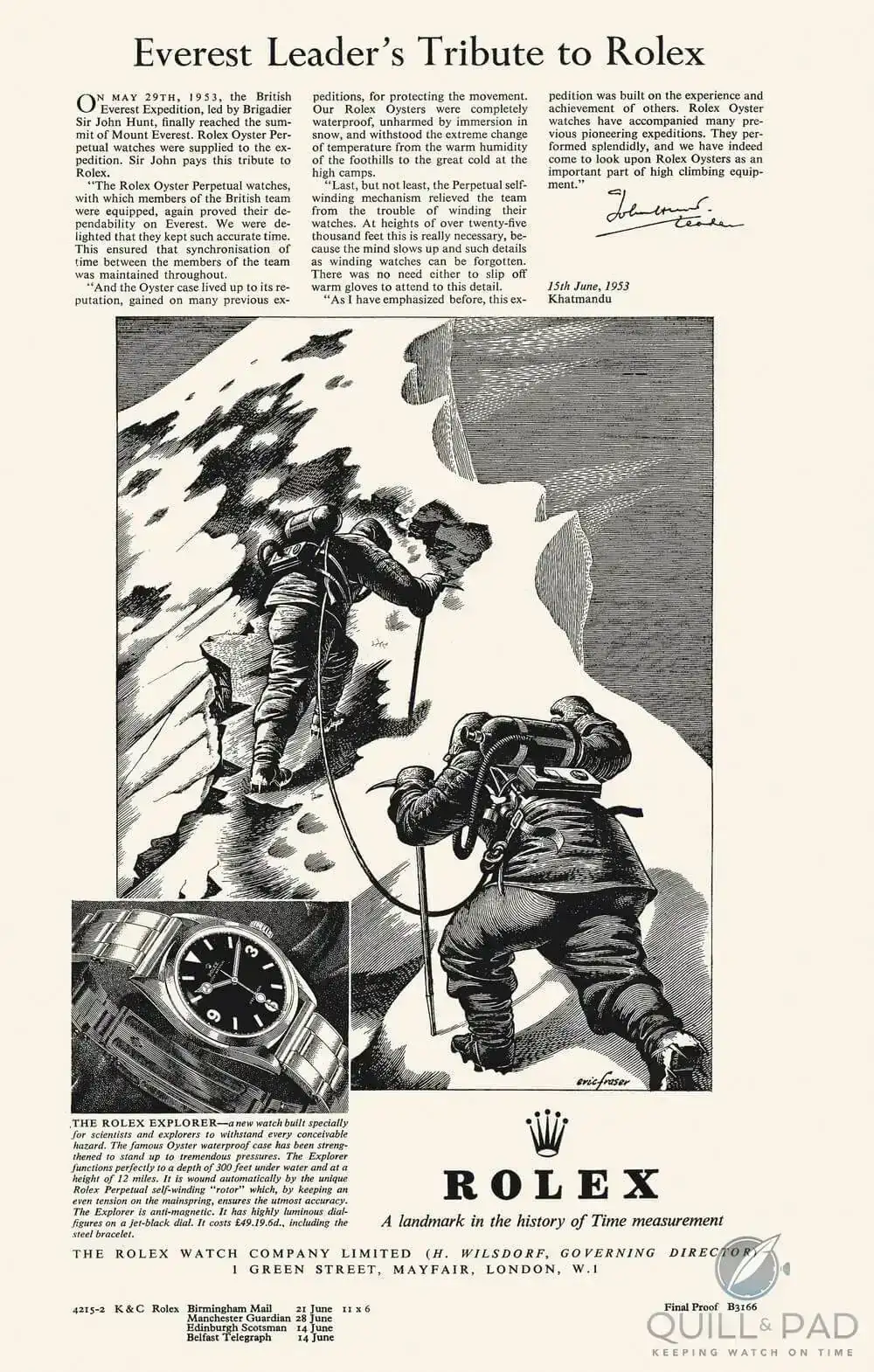 In our view, it is quite unimportant as to which person was wearing which watch at the top because, as has been said by Colonel Sir John Hunt, the whole job was a team effort[9]. In such a hazardous task it was surely not extraordinary that a climber would wish to wear two watches. One on each wrist, so that if one happened to go wrong he could rely on the other. This is a fact that can be seen from an actual picture of Colonel Sir John Hunt shown in The Times Everest coloured supplement recently issued. We supplied Rolex Oyster Perpetuals for all members of the British Mount Everest 1953 Expedition but if by a fortuitous chance Sir Edmund Hillary’s watch did not reach him or if he was not wearing it in his ascent of the last few hundred feet, then we regret that our first advertisements in connection with Everest suggested the contrary, although we had every reason to suppose that he received his watch[10].