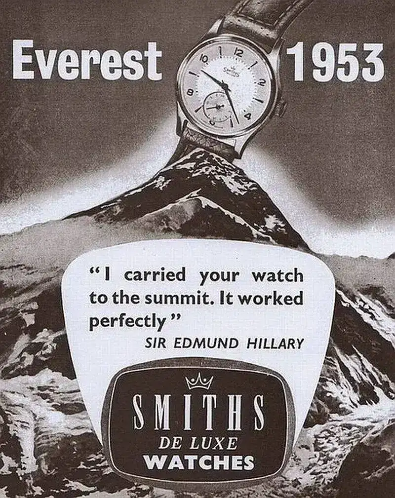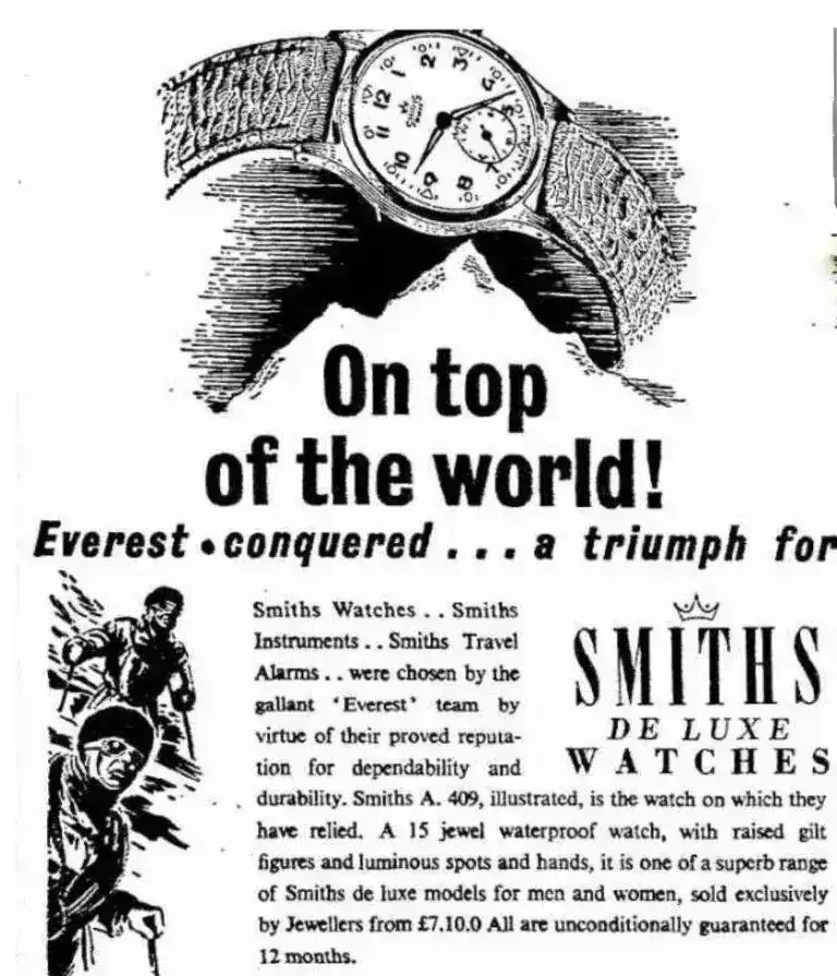 Cuando Edmund Hilary alcanzó la cumbre del Everst en 1953, lo hizo llevando instrumentos Smiths, y en sus propias palabras, un reloj Smiths De Lux. Smiths aprovechó las palabras de Hillary para lanzar una campaña publicitaria para promocionar su reloj como un reloj preciso y duradero. Los relojes que entregaba Smiths Watches eran modelos customizados con base en el modelo A404, con el calibre 400 de Smiths y un dial modificado, al que llamaron modelo A409.