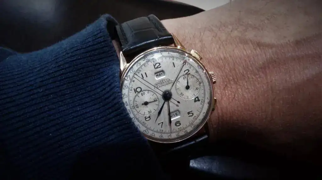 ya puedo lucir de nuevo el Angelus Chronodato. Para mi, uno de los cronos con la configuración de esfera más bonita que nunca se han diseñado. Debo decir que las fotos no le hacen justicia y aunque la esfera tiene algún desgaste en la grafía, es la original y así se va a quedar de momento, Para un reloj del 1942 no está nada mal. Espero que os guste tanto como a mi