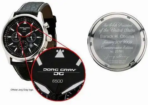 El reloj de Obama que luce en su muñeca es un, un reloj, aparentemente normal y corriente que cuesta menos de 300 dólares (aproximadamente unos 300 euros). El reloj, concretamente, es un cronógrafo, serie 6500, fabricado por Citizen, calibre Miyota, y made in China . Eso sí, el modelo que podemos adquirir nosotros no es exactamente el mismo que lleva Obama, ya que el logo que él lleva en la esfera es el del Servicio Secreto de los EE.UU, y sólo lo puede llevar el Presidente y los empleados de este departamento.![]()