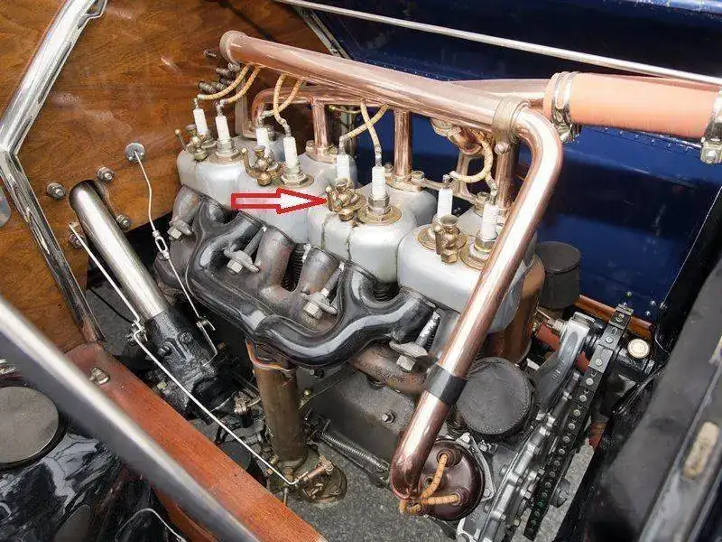 flecha roja: al no tener una bomba de agua, las tuberías de cobre llevaban el agua caliente al radiador y cuando se enfriaba de nuevo al motor, se llamaba circulación de termosifón.si nota que hay dos bujías por cilindro, porque eran dos tipos de ignición