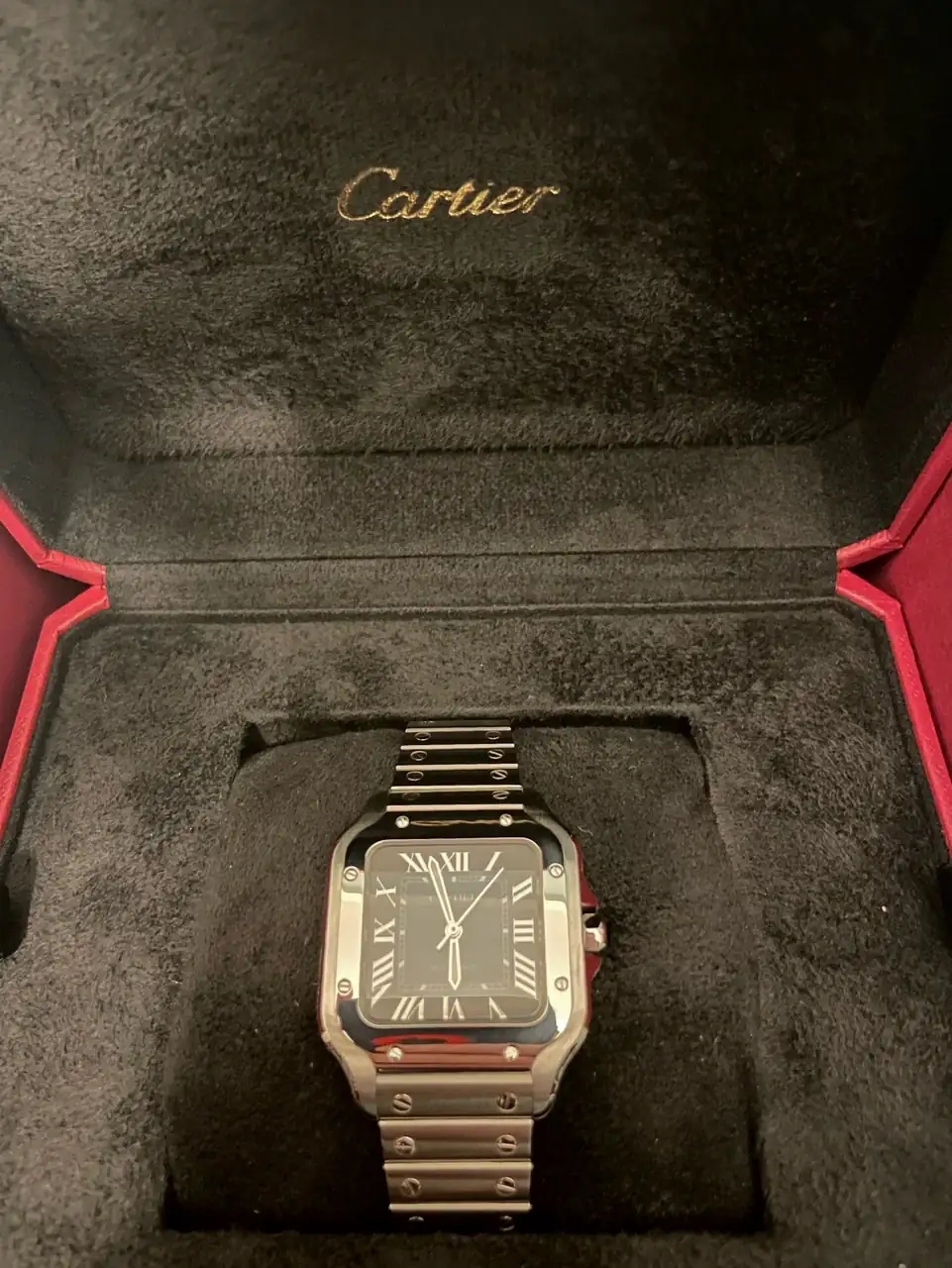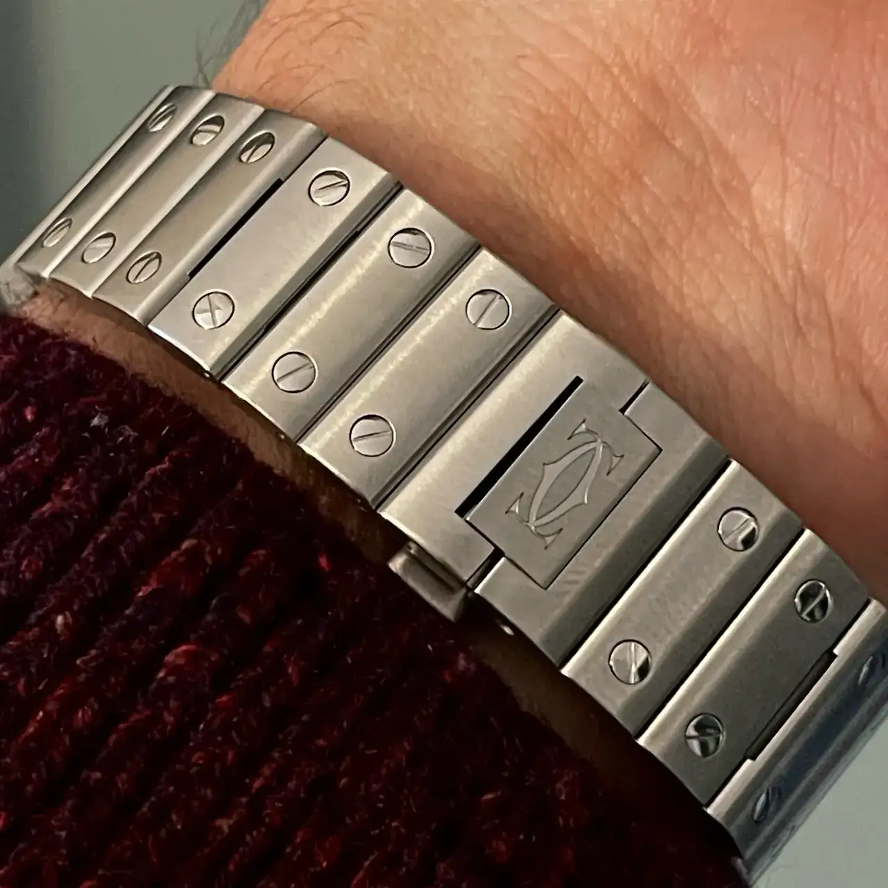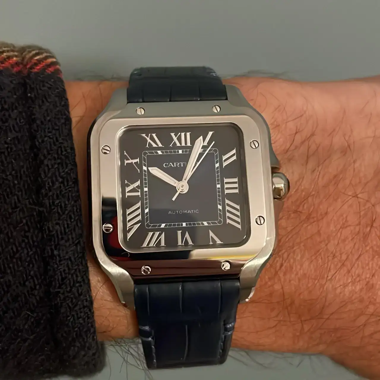 El reloj es un cartier Santos, en su modelo mediano, mi pequeña muñeca de 16,5 cm no permite llevar grandes modelos, aunque siempre me han gustado los tamaños contenidos.