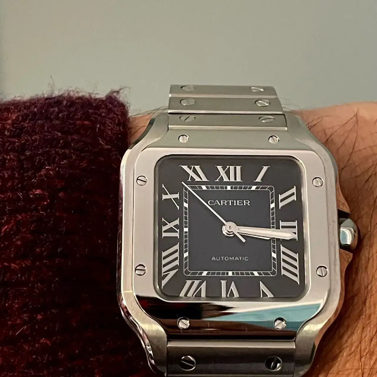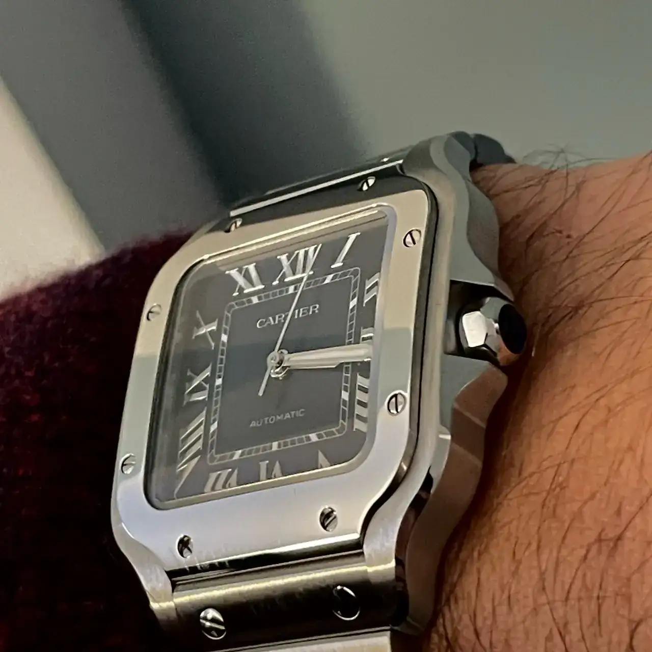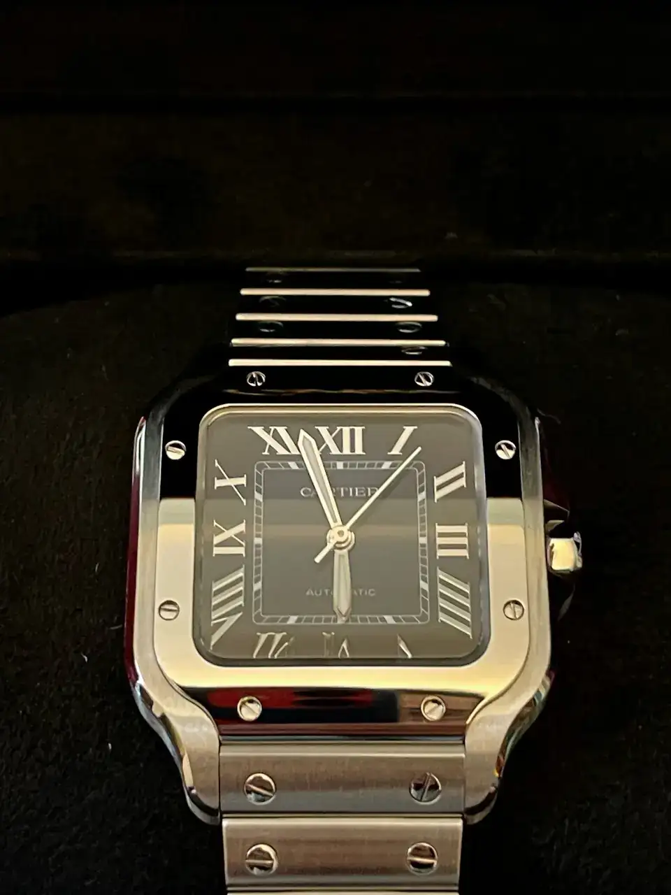 El reloj es un cartier Santos, en su modelo mediano, mi pequeña muñeca de 16,5 cm no permite llevar grandes modelos, aunque siempre me han gustado los tamaños contenidos.