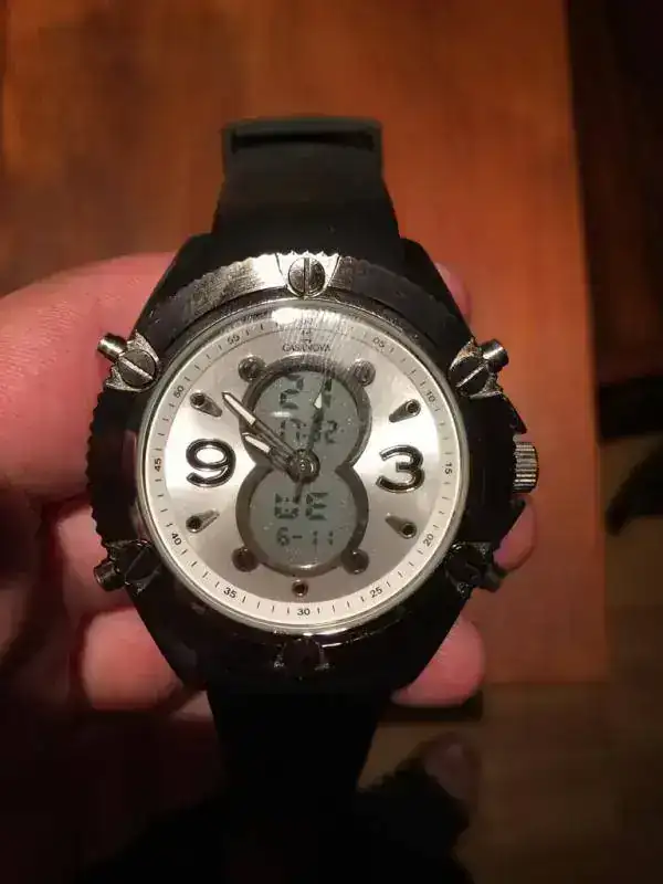 El pulsador superior izquierdo es la retro iluminación, tiene crono, creo que alarma... Un piezón.