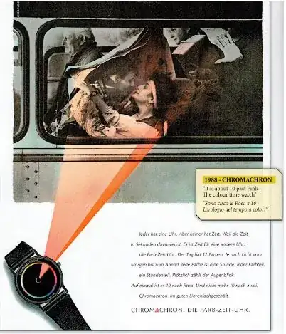 Con este enfoque se pasó al reloj de pulsera el cual con relativo éxito se comercializó. En 1976 los relojes Chromachron usaron una estrategia de marketing interesante apuntando al mercado norteamericano con el primer vuelo comercial del avión Concorde con el slogan “El reloj más relajado en el avión más rápido a América”. Otra publicidad del Chromachron es esta de los 80s: