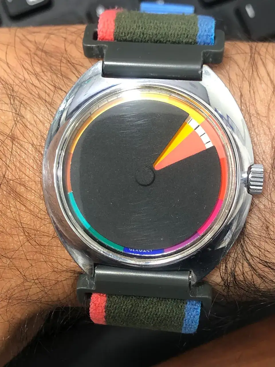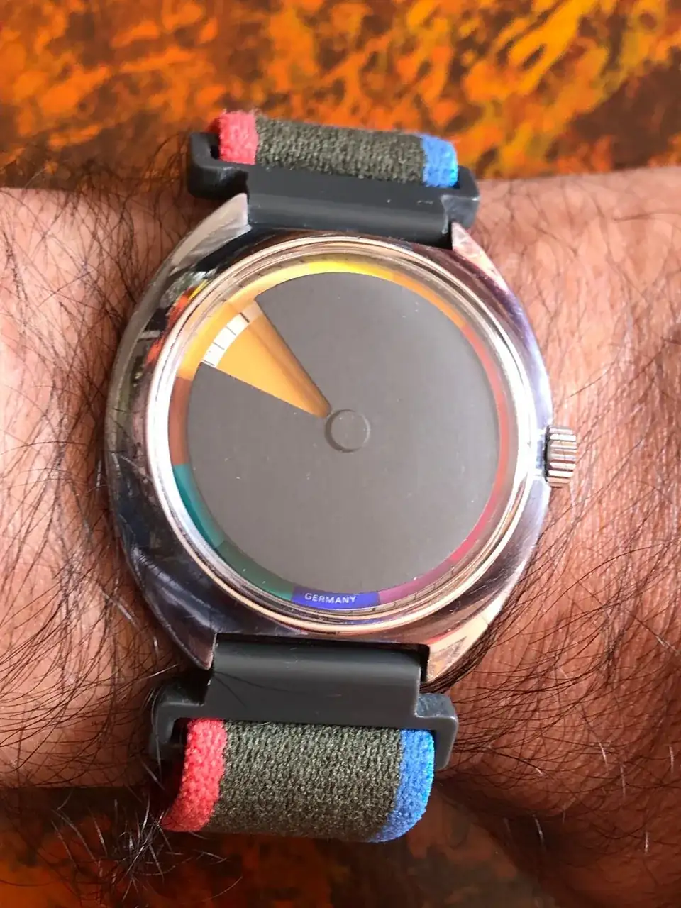 De los relojes que tengo los cuales no siguen el patrón común de dar la hora sobre un círculo de 360º dividido en ángulos de 30º para determinar cada hora con 2 o 3 manecillas que recorren la circunferencia marcando horas, minutos y segundos de las más exacta forma posible, se destaca este Chromachron el cual fue diseñado como un reloj anti stress dejado a un lado la presión de la sociedad moderna de ser puntual dada su inhabilidad para mostrar la hora precisa.