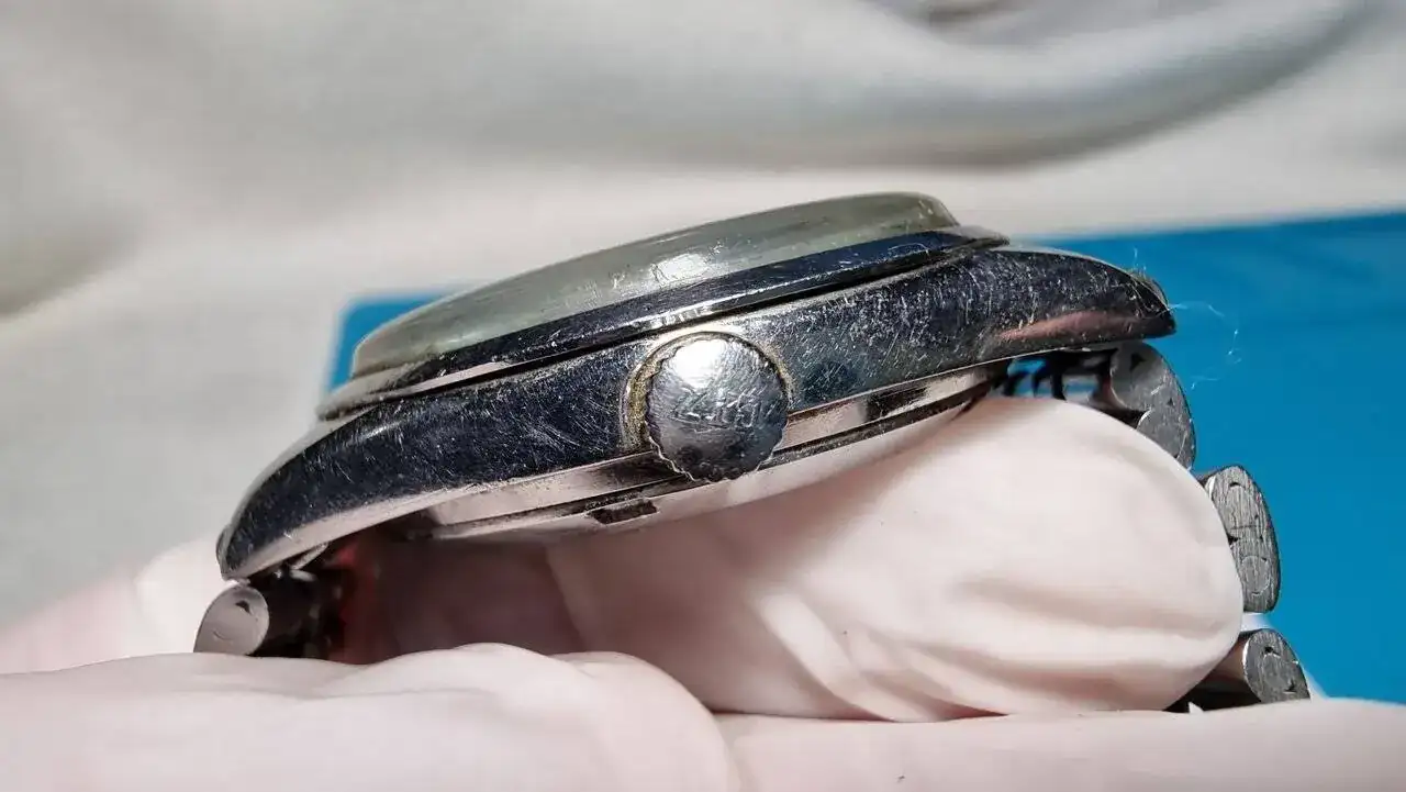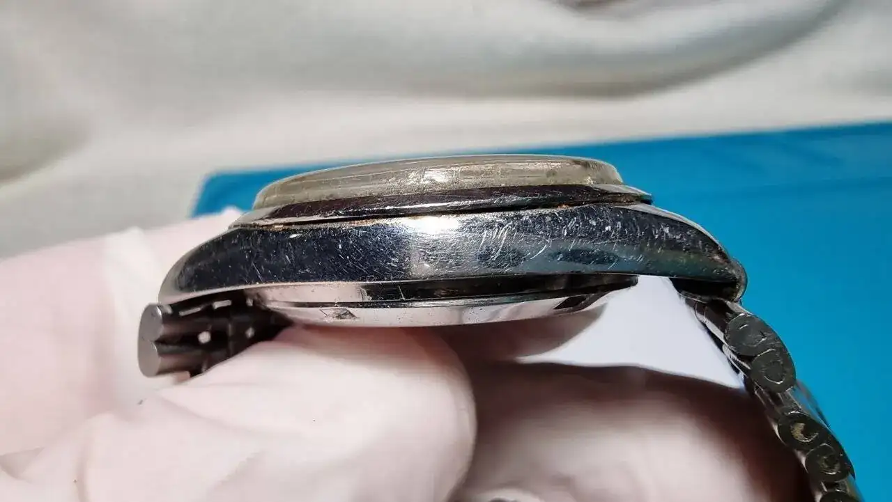 El problema aquí residía en que la de este angelito estaba muy deteriorada, no les encontré, ni a la caja ni al bisel, un solo milímetro cuadrado donde no hubiese algún rayón, además algunos de ellos eran de cierta entidad y calado; también en las caras superiores de las asas y en ciertas zonas del bisel eran notorias algunas mellas y golpes. Algo favorable fue encontrarme que la corona era original con su "CTZ" en relieve, aunque tampoco se libraba de los rayones.