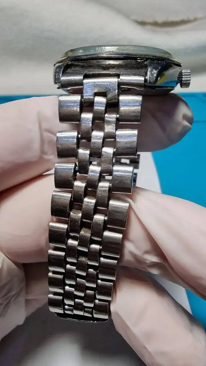 A priori ya encontraba varias cosas muy evidentes: el reloj estába muy trotado y la sulfatación presente en los índices aplicados de la esfera, así como en el anillo tensor del plexi, era un signo inequívoco de que la humedad había penetrado en el interior de la caja en algún momento dado, por lo que podía deducir que, o bien existía una ausencia o degradación en las juntas de tapa y/o corona (cosa imposible de confirmar partiendo de estas imágenes), o bien el plexi había dejado de ser estanco, cosa que se podía intuir a partir de los evidentes signos de deterioro que tenía, pero tampoco se podía aseverar mientras no tuviese el reloj en la mano. Lo que me quedaba claro es que la esfera con los índices así de sulfatados, aparte de otras afecciones que pudiese tener, iba a ser prácticamente imposible de recuperar. Las manecillas, al menos, sí parecían estar mejor conservadas, pero me preocupaba que tanto en las dos fotos del anuncio como en la que me facilitó el vendedor (que se supone se hizo algún tiempo después y tras manipular el reloj) la posición de estas fuese la misma, ni siquiera la del segundero se había movido algo, lo que me hacía sospechar que este ciudadano podía tener también algún fallo mecánico, o mucha suciedad acumulada unida a una total falta de lubricación, que impedía que su movimiento pudiese iniciar la marcha. Asimismo era algo manifiesto el pésimo estado del brazalete en general; tampoco sabía si la corona era original (me refiero a firmada), pero sí parecía mantener su acabado dentado en buen estado.