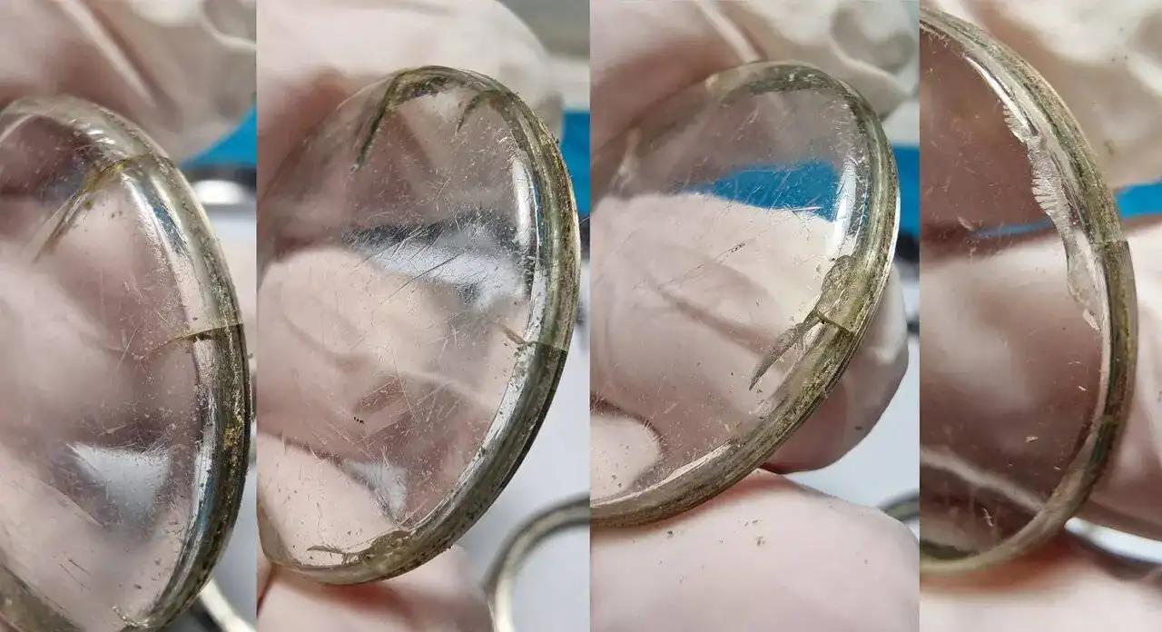 Tras estudiar los numerosos daños con los que contaba el plexi (y su anillo tensor) me quedaba bastante claro que era el elemento causante de la brecha en la estanqueidad de la caja y por donde la humedad había penetrado con más facilidad. Asimismo ese amplio deterioro, que os expongo en el siguiente políptico, era el que hacía inviable su recuperación y reutilización, por lo que no me quedaba más remedio que hacerme con un nuevo plexi de indénticas especificaciones: