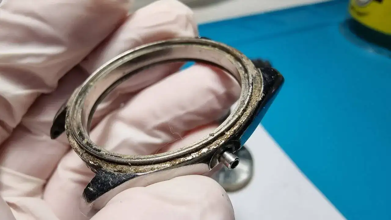 Al desmontar el bisel, tanto su cara interna como los asientos realizados en la carrura para este y para el plexi, estaban totalmente colonizados por ingentes cantidades de bardoma ya solidificada: