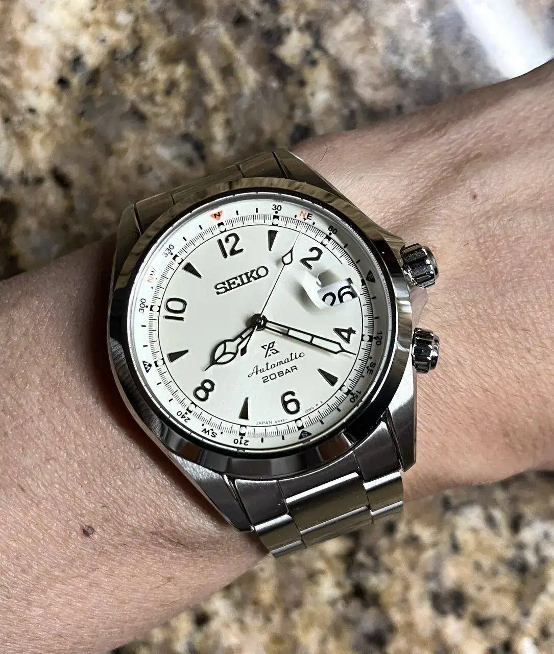 Sin duda queda precioso con la correa marrón.Hoy con el Alpinist blanco-crema, creo que esta correa como dijo algún compañero es la que mejor le va