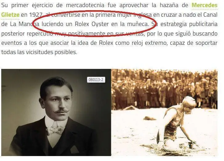 Observa que me has puesto la hazaña de Mercedes Gleitze: " In 1927 a Rolex Oyster crossed the English Channel, worn by a young English swimmer named Mercedes Gleitze". Rolex dice que Mercedes "vestía" la caja Oyster y todos deducimos que lo llevaba en la muñeca y que estuvo 10 horas soportando los golpes sobre el agua. Mercedes llevaba el Rolex atado al cuello. Rolex no dice "wristwatch", otros lo dicen por ellos: