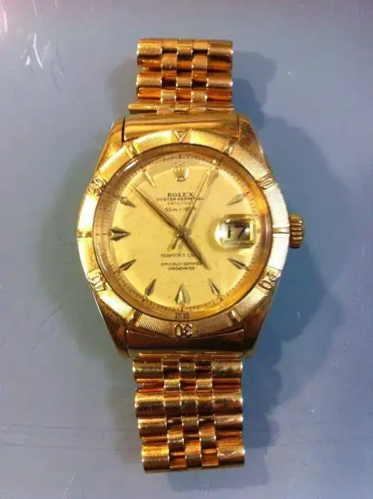 Efectivamente, el reloj de caja de oro, era provisto en el estuche de fábrica, con dos correas de cuero, con hebilla de oro con el símbolo de la coronita de Rolex. Si se deseaba el reloj con un armis metálico de oro (Oyster o Jubilee) debía solicitarselo como un adicional.