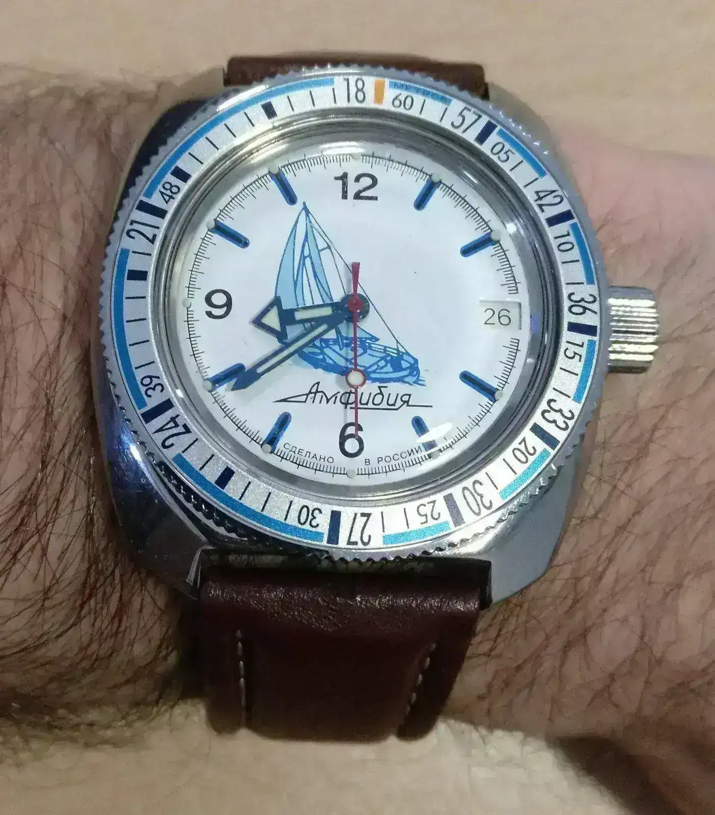 Tengo un Vostok Amphibia Sailboat (710615) desde hace un año, que iba bien. Como todo, siguiendo la progresión de la enfermedad, decidí hacerle un mod. Un amigo de fuera del foro me cambió las agujas y la tapa del fondo, y se ha convertido en el ruso futbolero. ¿Por qué futbolero? Porque no para de hacerme paradinhas el c****n. A lo largo del día me lo puedo encontrar en la muñeca parado, collejita rusa, poner a la ahora y anda, hasta la siguiente. Y a las noches lo mismo (no me lo quito); como me muevo menos, se queda parado más rato (me levanto con 1 a 5 horas de retraso).