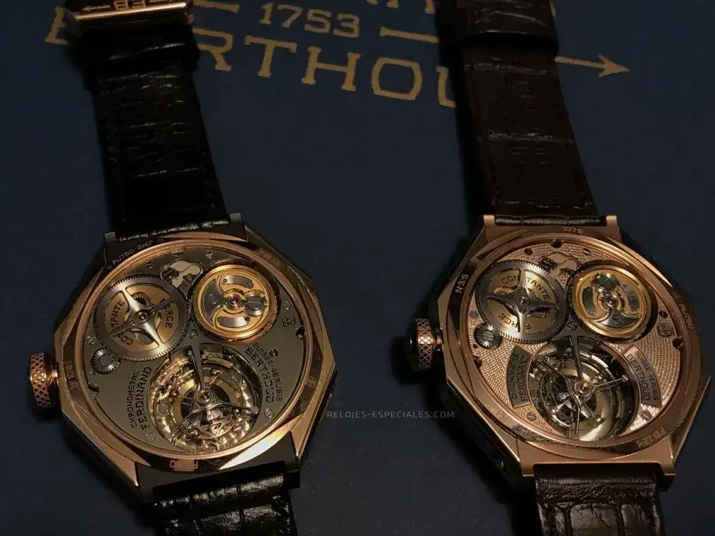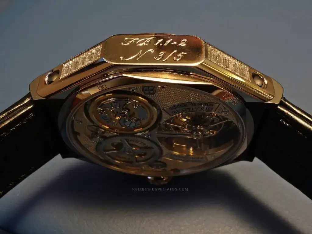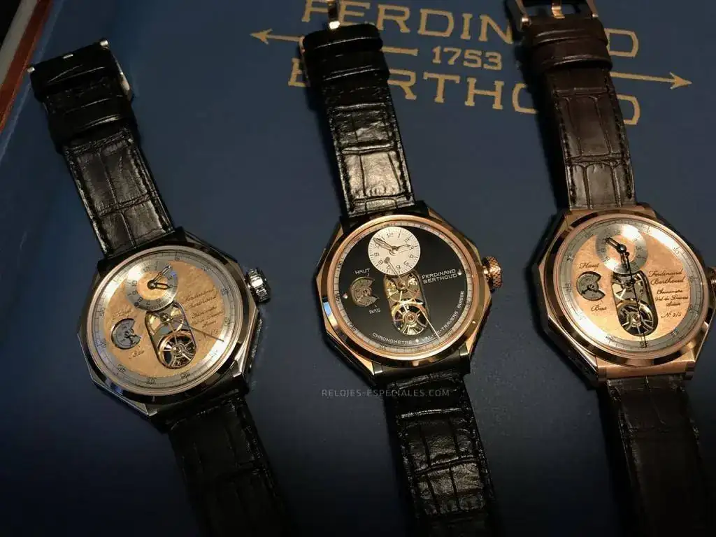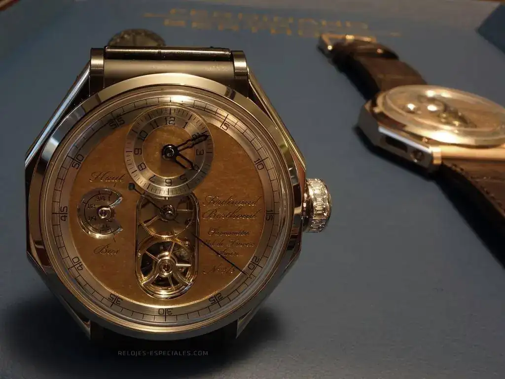 Pasamos ahora a Ferdinand Berthoud, un nombre que Karl F. Scheufele, co-presidente de Chopard, se empeño en recuperar para ponérselo a la marca de la relojería más sofisticada de su grupo, aunque funciona como independiente y se inscribe en el "Carré d'Horlogers", una zona dentro del SIHH dedicada a ellos. Hace cronómetros de marina tamaño muñeca. Es una marca muy joven (no más de cuatro años), y propone series limitadas de piezas exquisitas. Las de este año se llaman FB-1 Oeuvre d'Or por razones que vas a ver enseguida. Son dos series de cinco unidades, una de ellas con caja de oro gris con diamantes talla baguette (que es lo que le pide cierto tipo de clientes) y la otra en oro rosa.