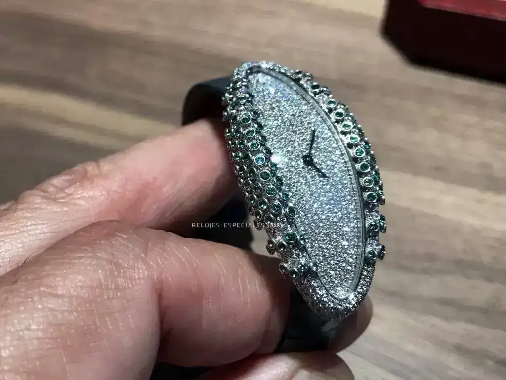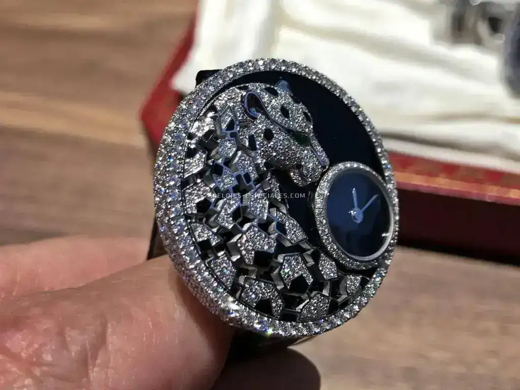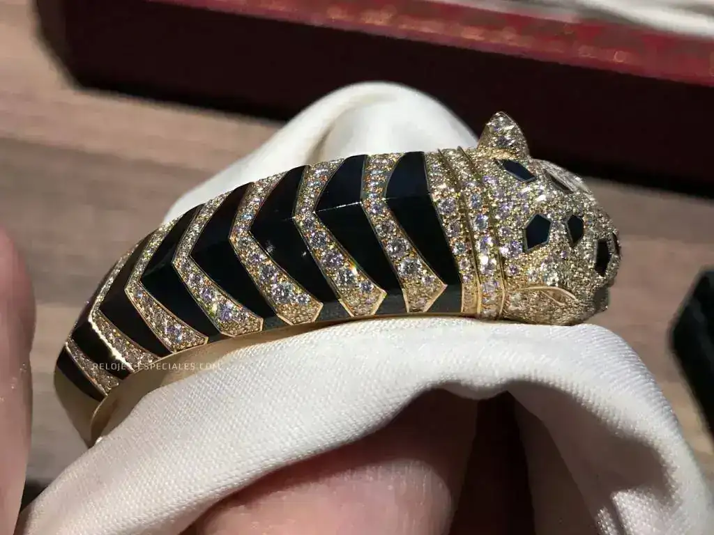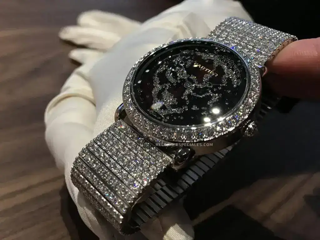 Como hipnotizante es ver "llover todos esos diamantes mientras van formado la cara de la pantera. Las piedras de fuera todavía son más...