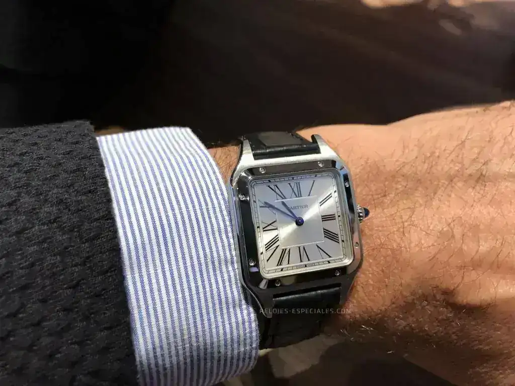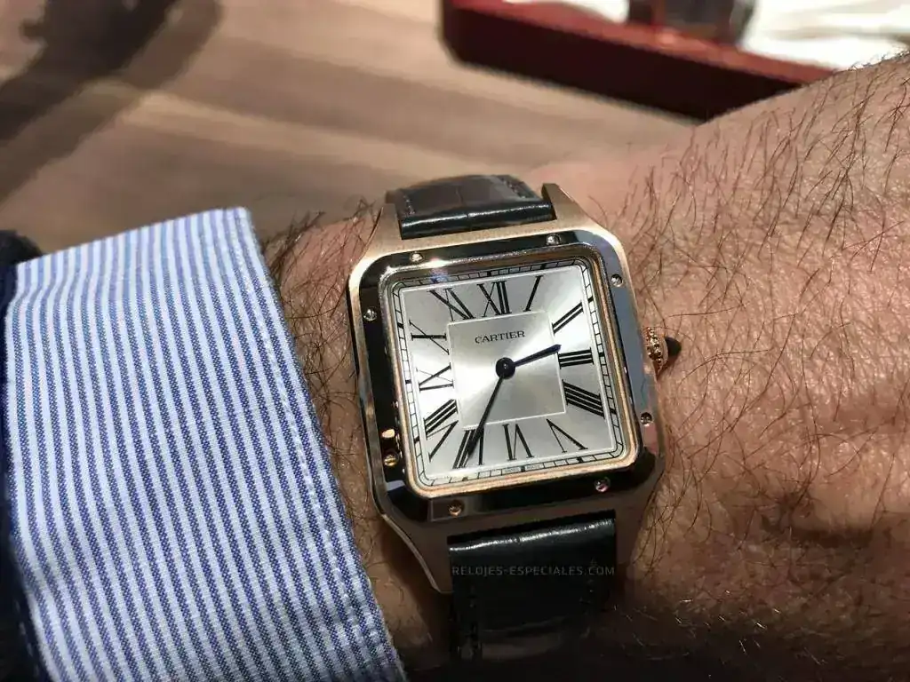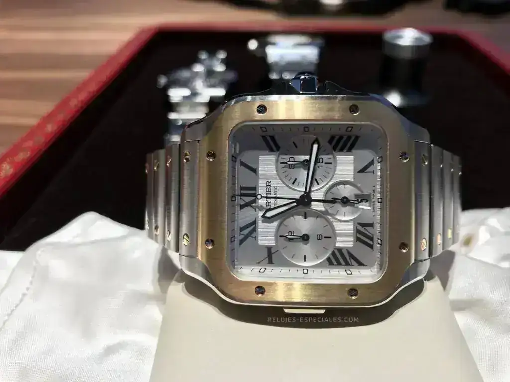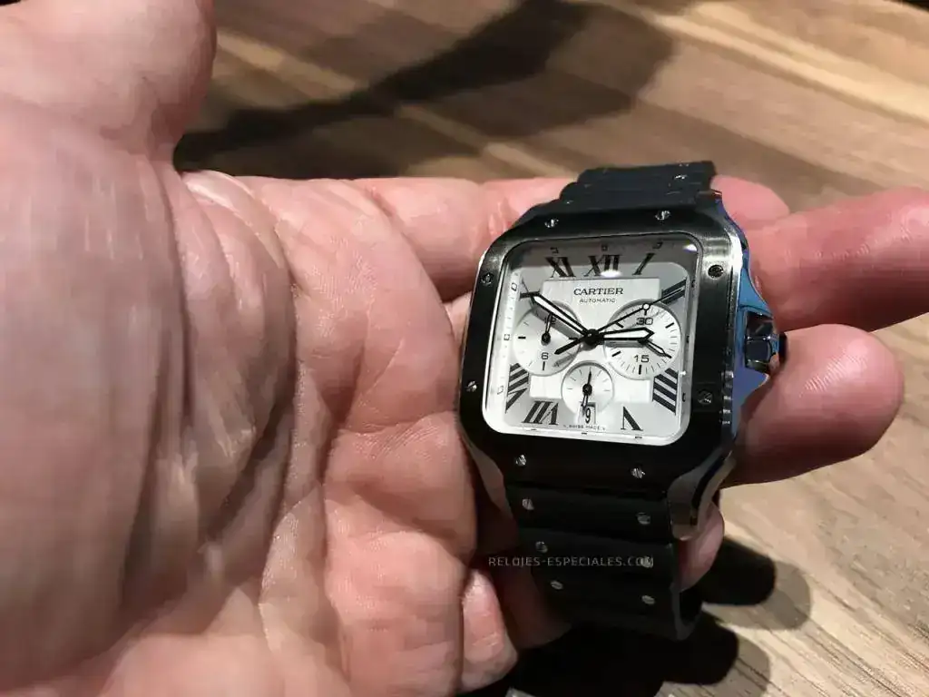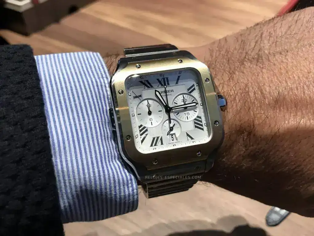 Pero no sólo hay cuarzos. El Santos XL sigue por aquí y trae un crono bastante contundente. Manufactura Cartier, arranca y para con el pulsador a las nueve y resetea pulsando la corona. Muy suave en ambas acciones.