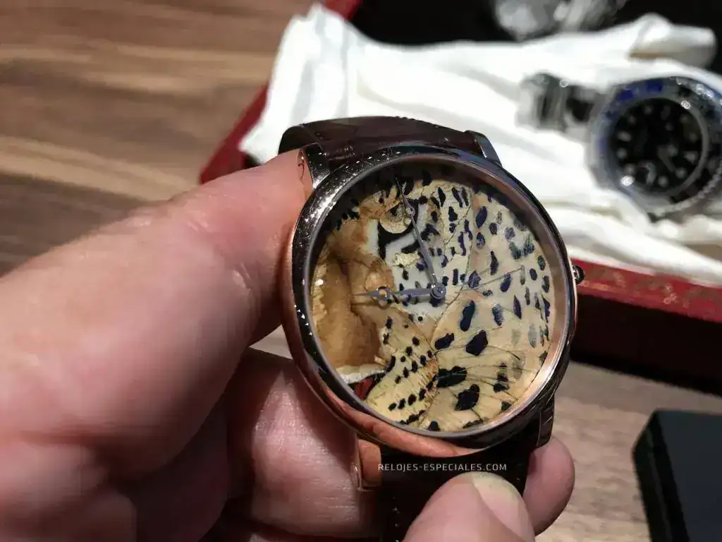 Al arte de la orfebrería se unen las artes aplicadas, como la marquetería con piedras duras (también hay diamantes). No hice foto a oscuras, pero esos ojos están rellenos de Superluminova y el efecto es hipnotizante