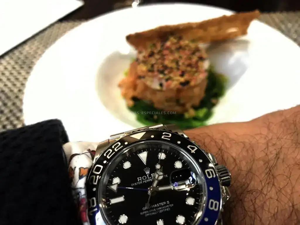Aunque eso no es lo más grave: igualmente en oro, el calibre del GMT es una pequeña escultura. Movimiento de manufactura, la corona superior pone en hora ambas "subeferas" y el pulsador de abajo adelanta una hora con cada pulsación.