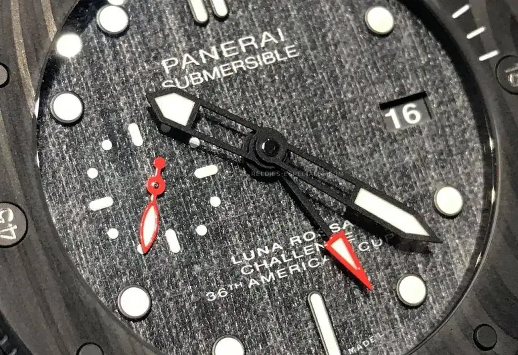 Esfera de oro fresada a mano con inscripciones igualmente ejecutadas a mano. Está atornillada desde atrás para -a diferencia de las primeras series, en el centro- ocultar los tornillos.