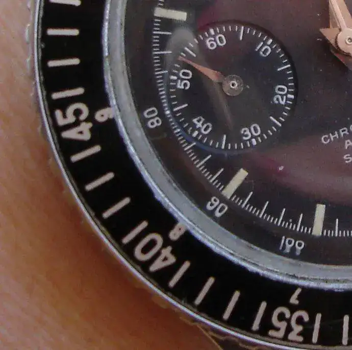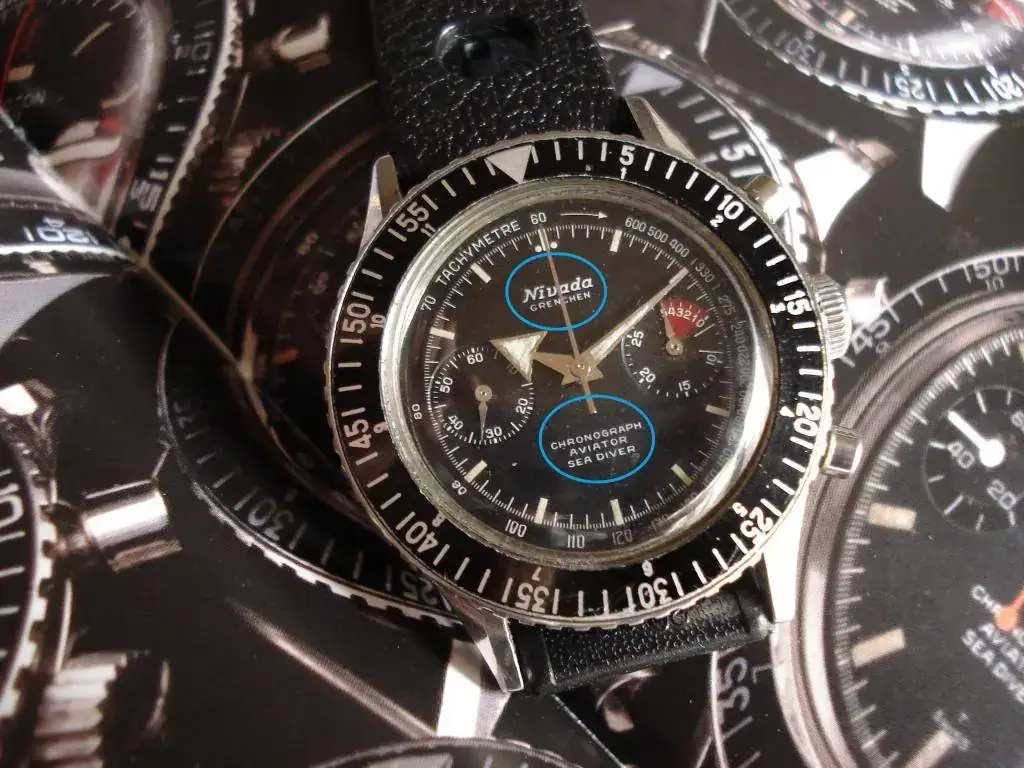 La mía va marcada únicamente como Nivada, con su tipo estilizado, y debajo Grenchen, lo cual indica que fue comercializado por la suiza y se marcó fuera de Estados Unidos, donde como consecuencia de los litigios y restricciones suscitados por Movado se optó por incluir también en la esfera la marca Croton, con la que estaba asociada Nivada desde finales de los años 30 para la comercialización en Norteamérica. Otra curiosidad que se aprecia rápidamente es la indicación Chronograph en lugar del posterior Chronomaster, como corresponde a los primeros modelos que montaron Venus 210. Y la inscripción Swiss Made aparece apenas visible, bajo el 120 de la escala taquimétrica