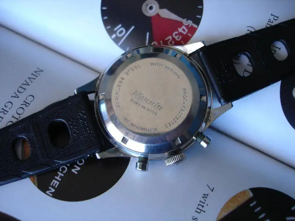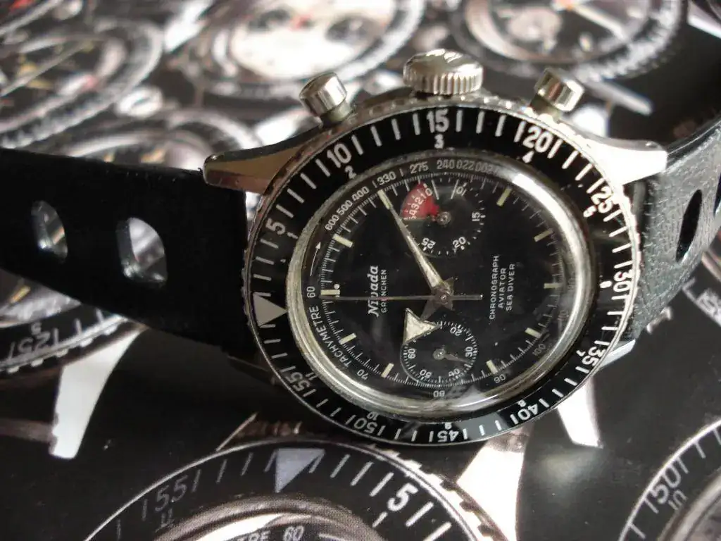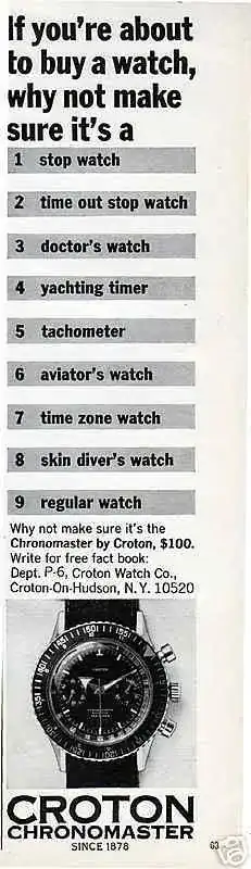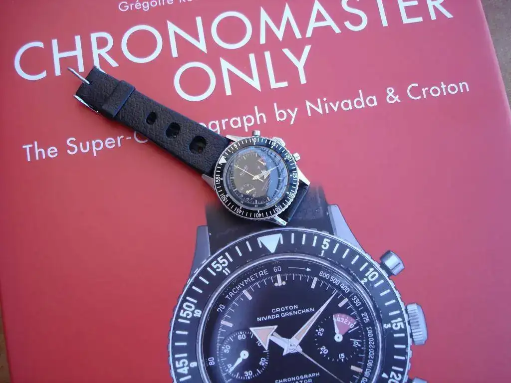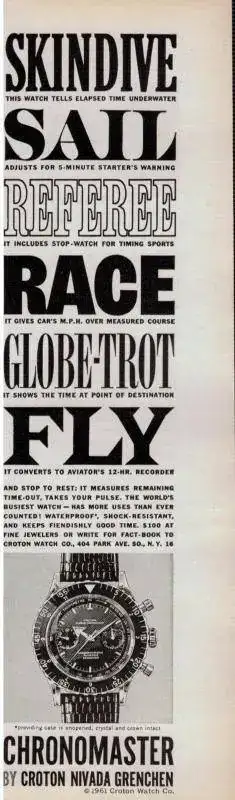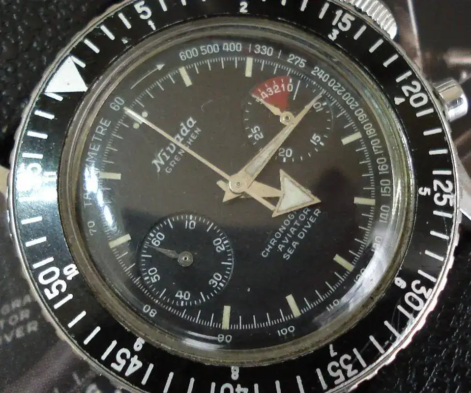 El modelo fue lanzado en 1961, fecha en la cual era el único reloj que combinaba tantas prestaciones: cronógrafo, resistencia al agua de 200m, escala taquimétrica, bisel giratorio de buceo, segunda zona horaria (también en el bisel, parte interior) y cuenta regresiva para regatas. Y todo ello en una caja de forma y tamaño convencionales. El modelo original en esa caja y diversas variantes se comercializó hasta comienzos de la década de 1970. Posteriormente aún siguió en el mercado varios años evolucionando a otro modelo de caja e incluyendo distintas indicaciones, como por ejemplo fechador y una tercera subesfera. Pero no penséis que en esa década de producción los señores de Nivada (y Croton) se estuvieron quietecitos… Todo lo contrario: se entretuvieron en sacar al mercado diversas configuraciones de sus principales componentes: 5 calibres, 6 ligeras variaciones de caja, 56 combinaciones de esferas y subesferas, 6 variedades de biseles, 14 estilos de saetas, 19 traseras, 5 tipos de coronas y 4 de pulsadores. Vamos, toda una orgía de variantes para dar fatiga a los coleccionistas y pie a los facedores de libros