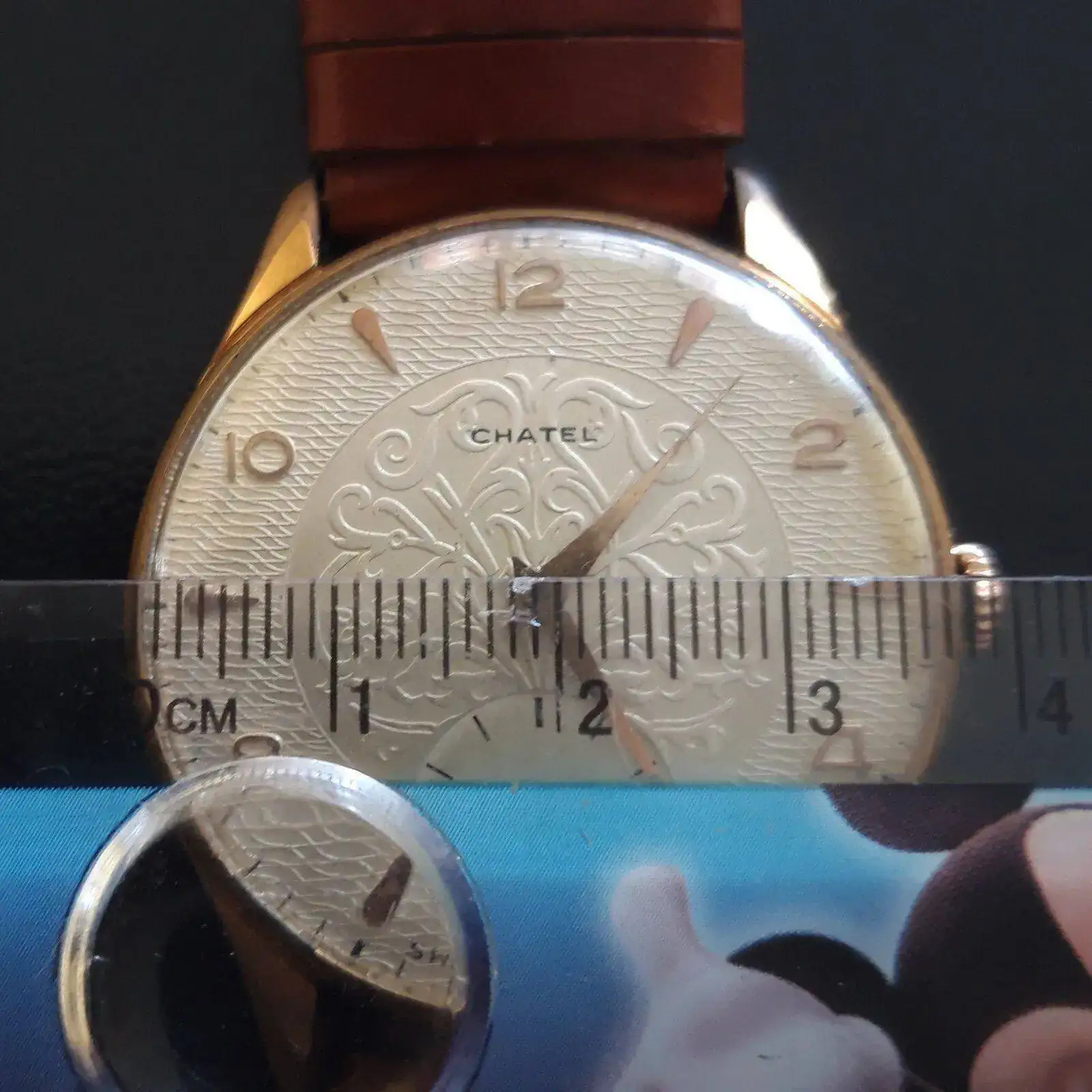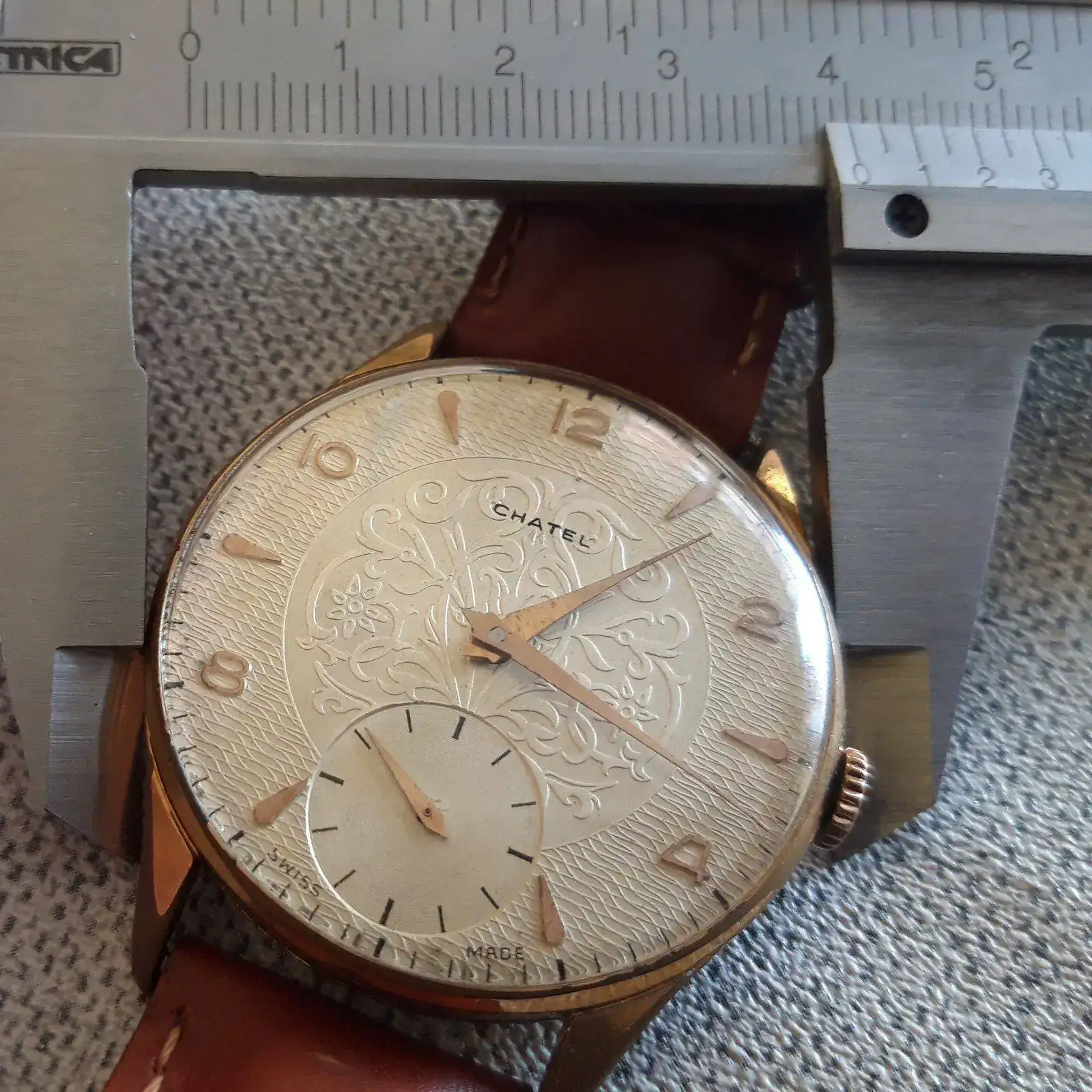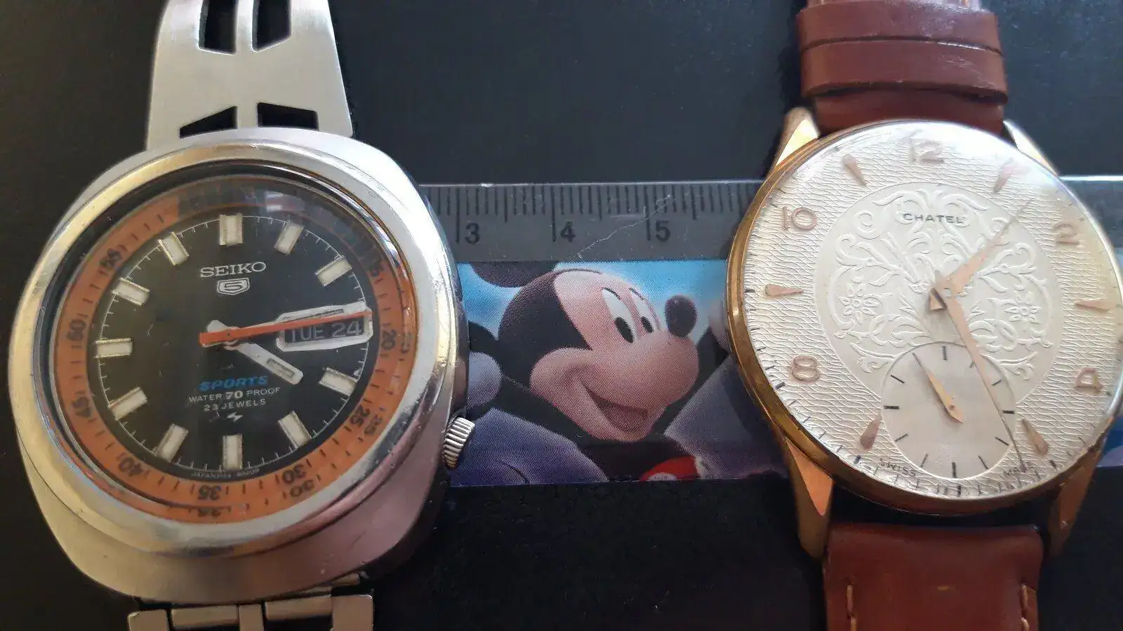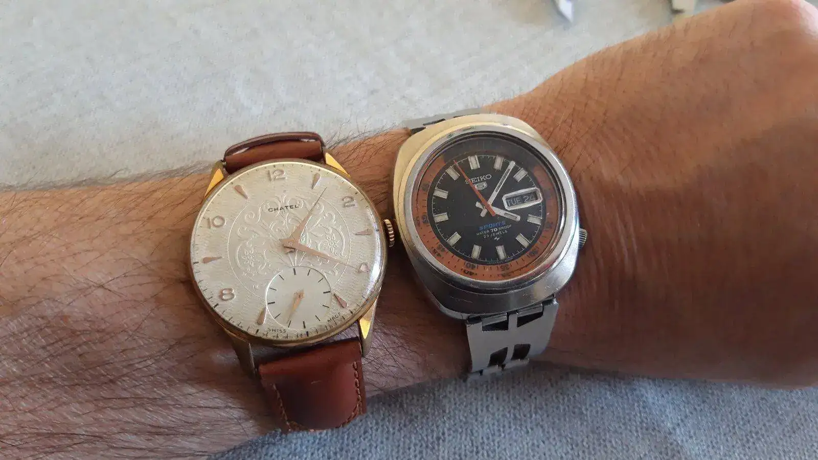 Usaré dos muestras: Un clásico cincuen-sesentero y un Seiko de 1969. Ambos miden 40mm de este a oeste, o de 9 a 3, PERO el Chatel no lo uso porque me parece desproporcionado, ridículamente grande, mientras que el Seiko me parece perfectamente apropiado.