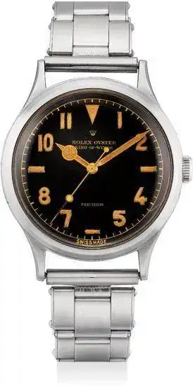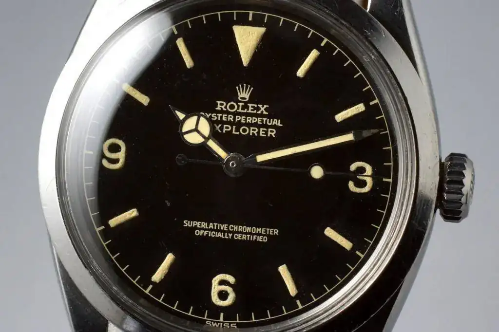 Este reloj si cumple muchas de las premisas, Rolex, extraordinario cargamento de material radioactivo luminiscente en agujas e índices, Oyster Perpetual. Esta configuración fue muy famosa e incluso se le considera el auténtico antecesor del Explorer.