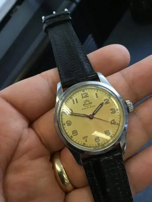 Es una pena pero el reloj tiene muestras claras de haber sido cambiada su esfera, ya que la de la foto es una t<25 yla original debería haber sido una esfera de Radio con círculo de minutos cerrado y letras doradas. Algo como este (y como el que pone Petefelay arriba):