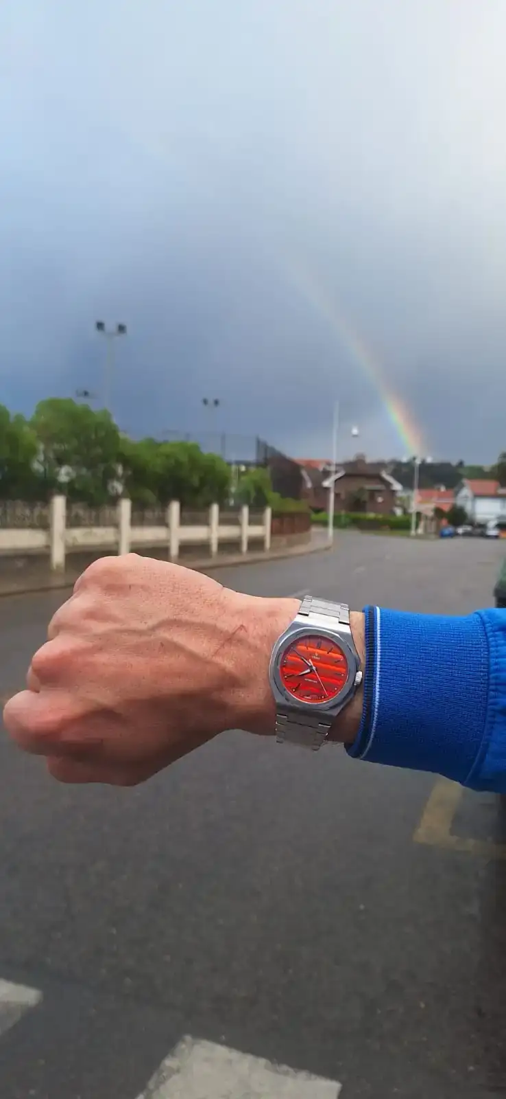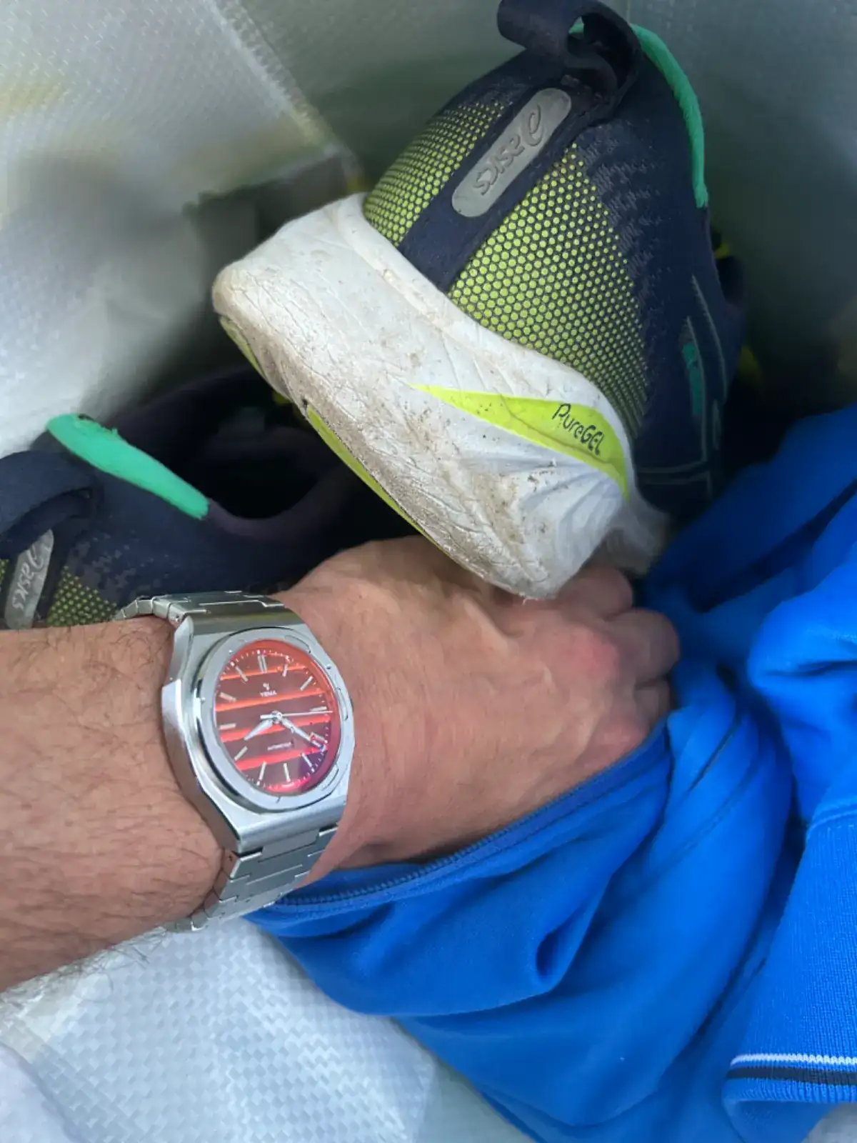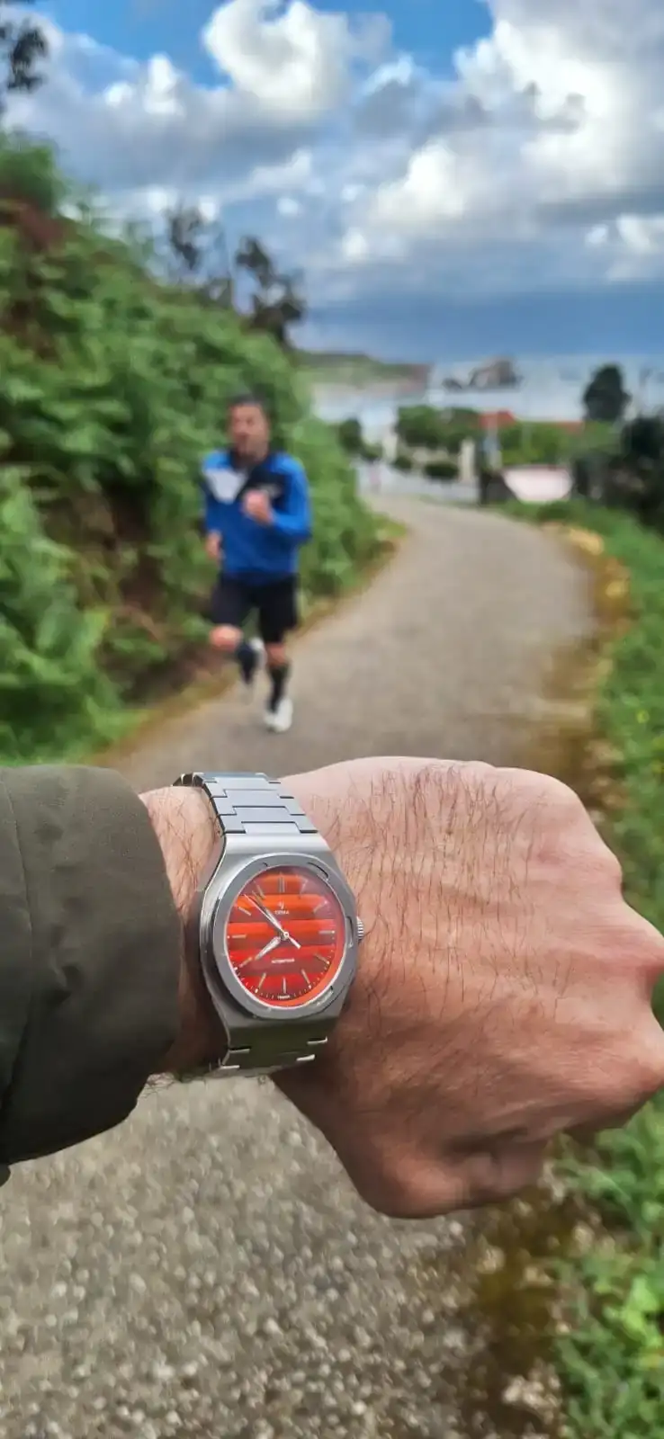 A la vez, tenía la cita habitual con mi amigo y entrenador “Fer” para correr a las 7 de la tarde. Entre unas cosas y otras no me detuve en todo el día a pensar en mi ilustre invitado, hasta que llegó la hora de recogerlo. Apurado, pero ordenado, aparqué delante de la oficina de Nacex y una vez lo tuve en mis manos, me fui al relojero para ajustar el brazalete (5 €). Ya con él en mi muñeca y casi sin solución de continuidad, salí directo a entrenar.