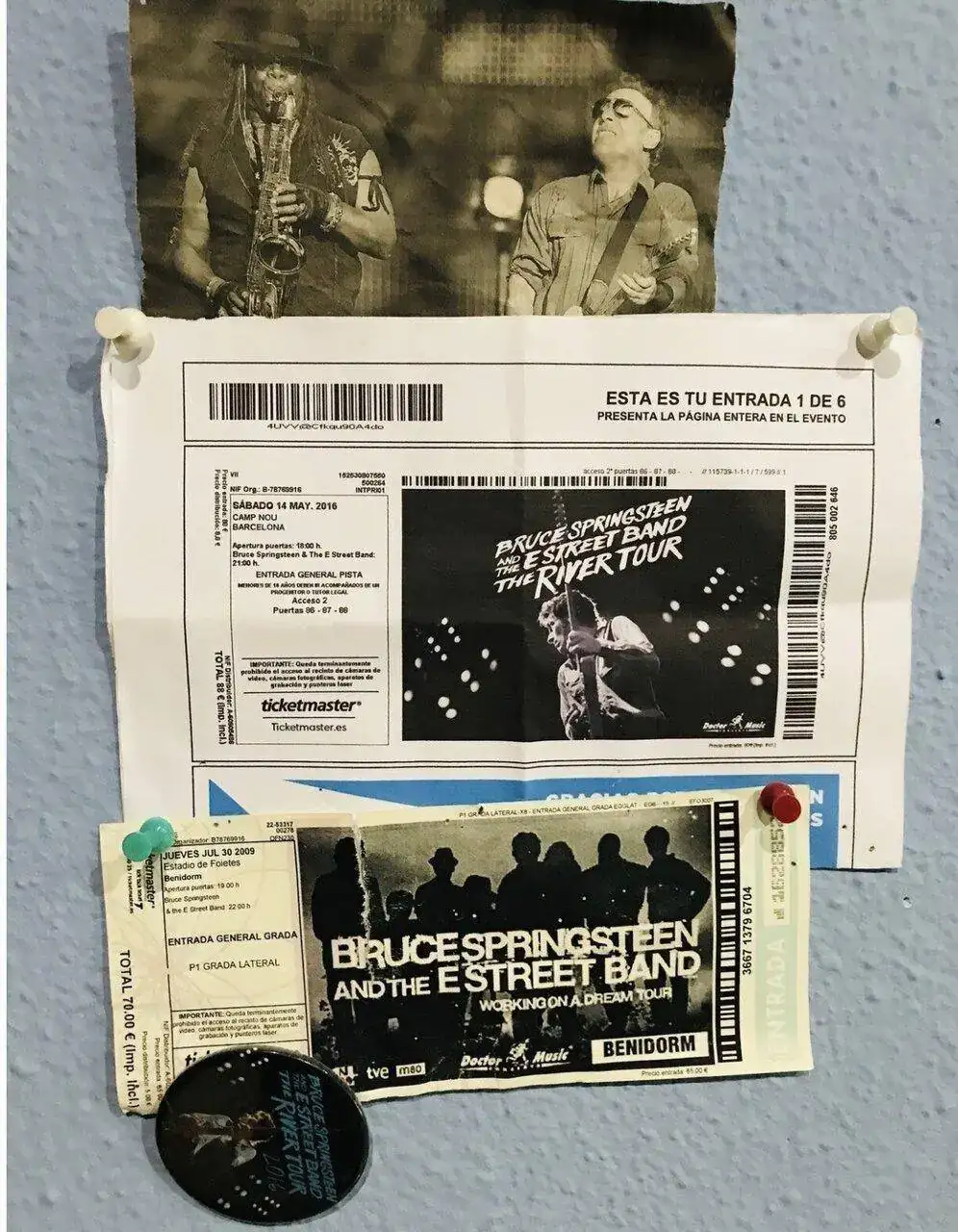 Aquí te enseño las entradas de Benidorm y Barcelona, las tengo colgadas en la pared, los mejores conciertos de toda mi vida, y eso que he ido a ver muchos grupos buenos…