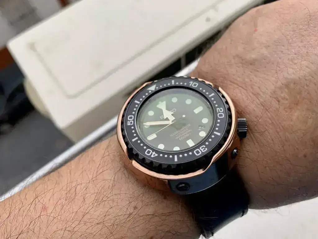 Es que ese tuyo ya es la ostia, creo que junto con el golden tuna reeditado son los más bonitos.Buenas, es la mejor manera de empezar en los tunas, no te asusta tanto cuando lo ves en directo, ese bisel acero es muy, muy elegante... ya sabes el emperador NO es tan grande...