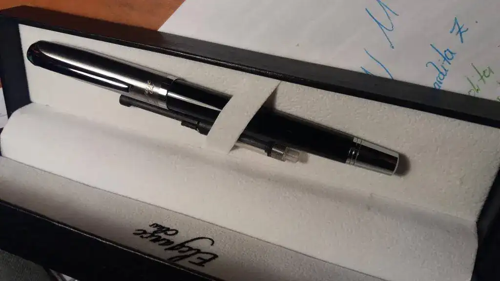 Hola hoy andaba de compras y me la encontre ba-ra-ti-si-ma las venden a la mitad de lo que vale una parker vector en mi pais, y como no me gusta el plumin pequeñisimo de las parker me la compre y para valer la mitad de lo que vale la parker venia en un bonito estuche con un cartucho y convertidor, de hecho no creía que fuese a escribir y llegando a casa quede atónito escribe y escribe bien y suave .-..