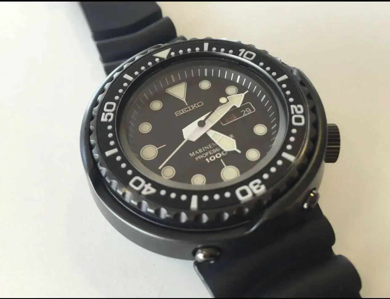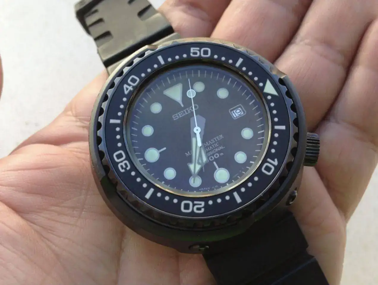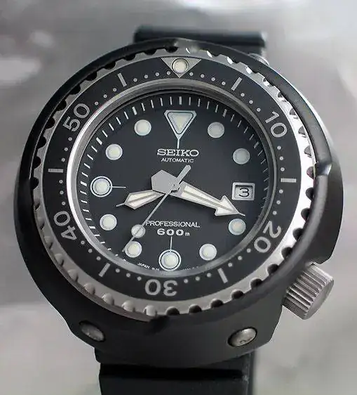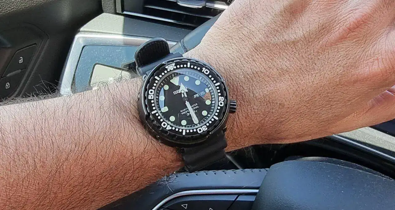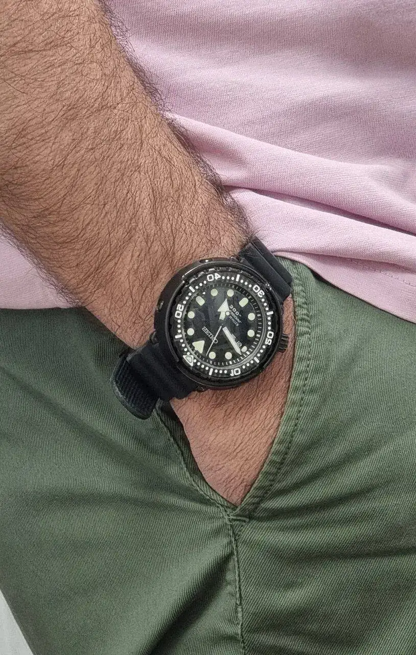 ). Hablamos, como imaginais por el título, del Seiko "Tuna".Hace casi tres años, en la Boutique Seiko, empecé a mirar estos modelos con curiosidad. Sinceramente ningún diver de Seiko me había enamorado lo suficiente, pero quería seguir probando... Como era de esperar los encontré absurdamente grandes para mi muñeca de 16cm. Pero oye, no parecía ser incompatible del todo. Y sobre todo era diferente... Muy diferente.
