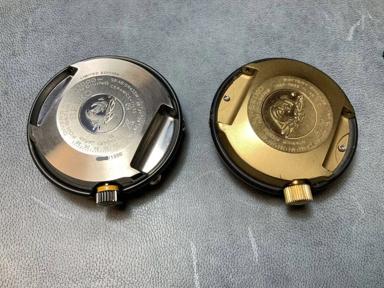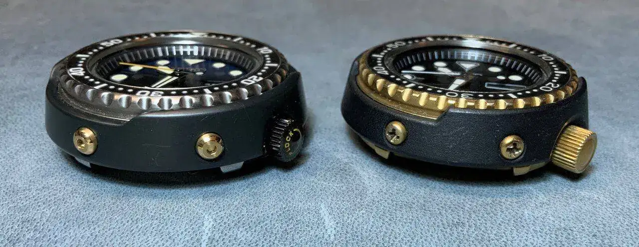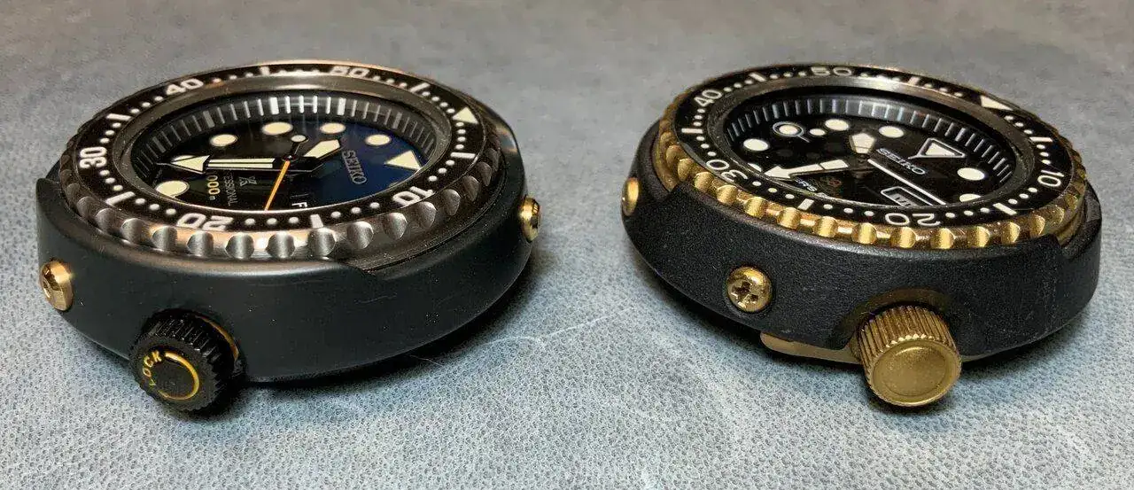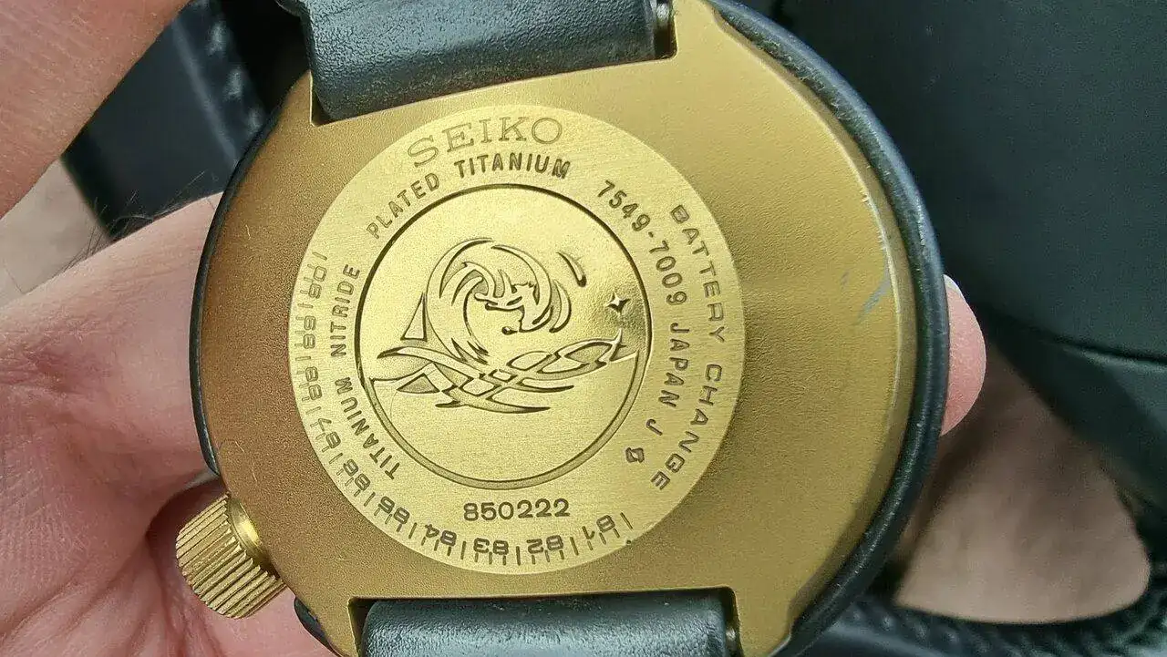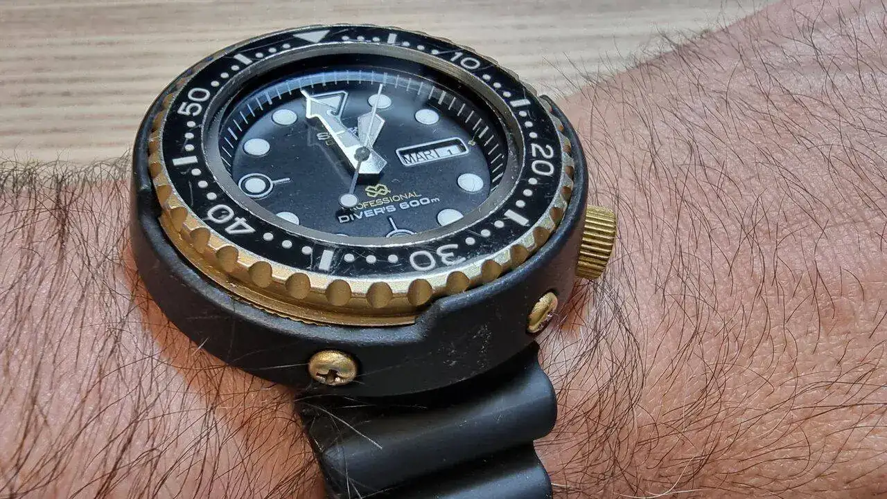 El 7549-7009, de 600m, comparte tamaño con su homenaje moderno, pero tiene leves diferencias, de altura del protector o el bisel. La caja también es de titanio, con un revestimiento de nitrido que le da el peculiar, y clásico, toque dorado. Dicho revestimiento se aplica también en el bisel, la hebilla y la corona. La imagen final es increible. El dial presenta el clásico "SQ" y "Diver's" con el que estampaban las versiones de exportación. En este caso, la fecha está en español e inglés. El bisel tiene un insert desmontable, sino que se integraba en la propia pieza dentada. Por cierto, el bisel es bidireccional, y funciona con 2 rodamientos, a las 6 y a las 12. Y es jod***mente duro de manipular. Está claro que eran relojes herramienta en toda regla. Mi llave inglesa es más delicada...