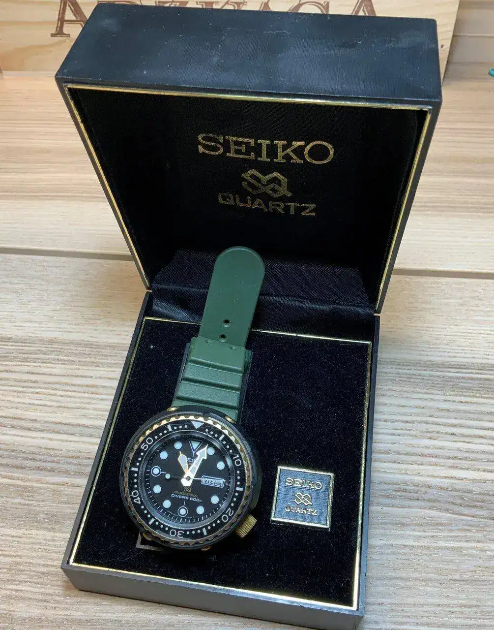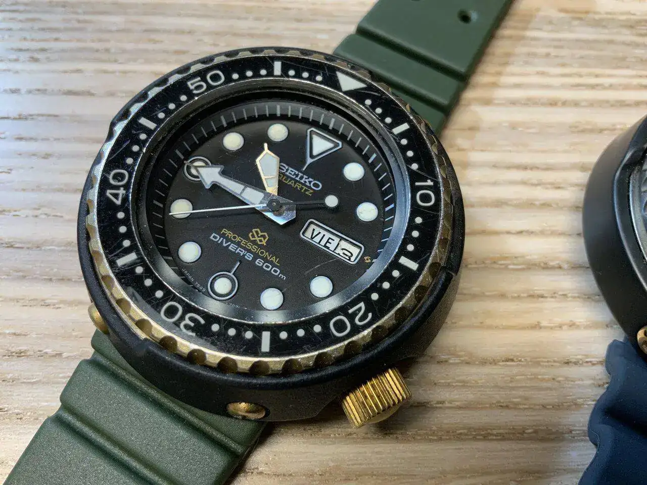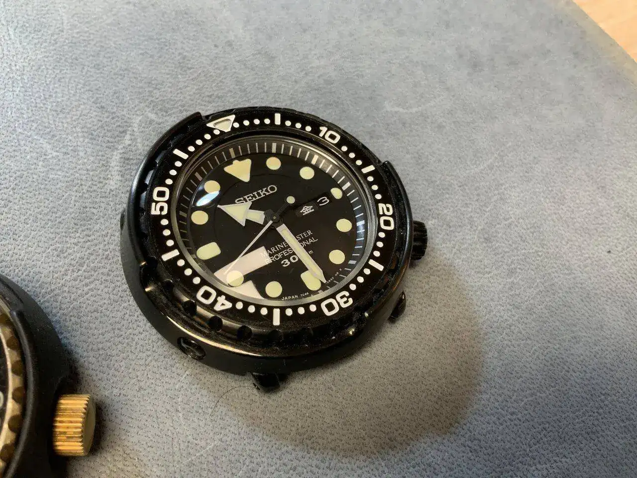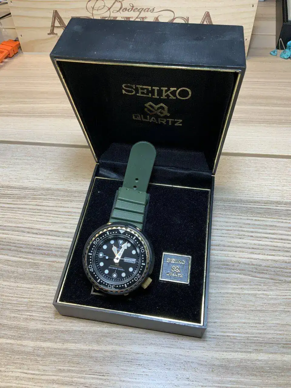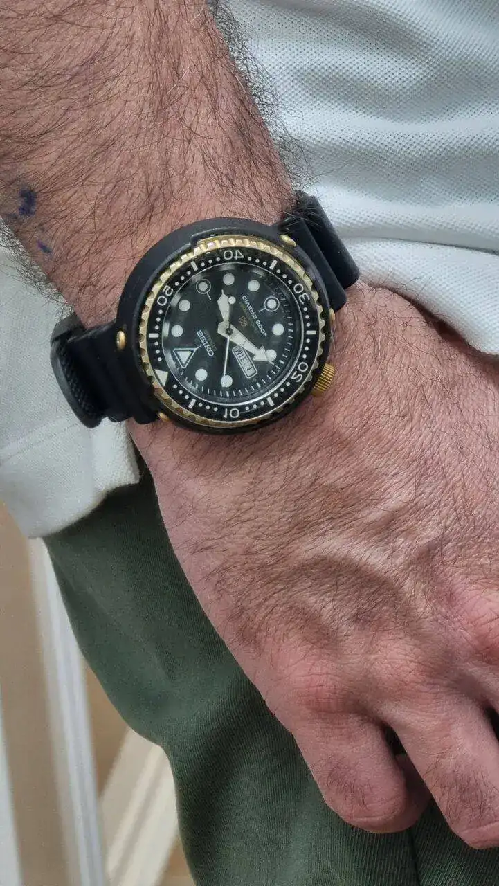 Pero no acaba aquí la historia... un buen amigo forero, que también está un poco atrapado por estos modelos, me avisó un par de días antes de otro a la venta, pero de los que le gustan a él, un buen vintage. Me enseña el anuncio, lo hablamos... si no te lo quedas tu me lo quedo yo, tenemos que probarlo, bla bla... Empiezo a negociar con el vendedor... y el domingo 22 de mayo, 7 días después de comprar mi primer tuna, me veo volviendo a casa en el coche con este auténtico clasicazo: un 7549-7009, o "Golden Tuna", fechado en mayo de 1978. Nada menos que 44 años ha cumplido ya el tío...