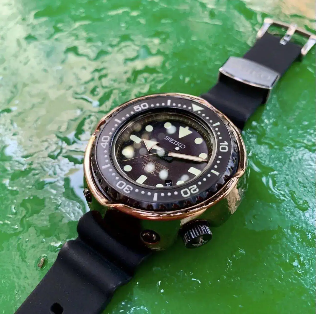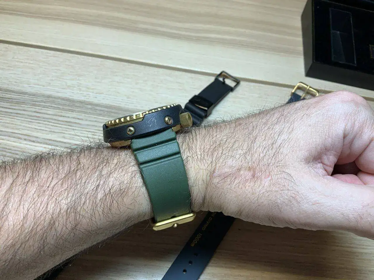 Desde entonces lo he tenido en el spa. Desmontaje, limpieza, compra de juntas nuevas, pila, alineación de agujas, leve reparación de dial, engrasado, montado, una correita nueva verde de Zuludiver que seguro que le iba a quedar de lujo con el dorado (bueno, en esta foto no sale), y finalmente aquí lo tenéis: