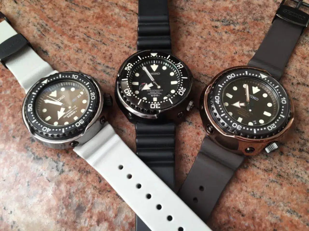 Y así estaba, la mar de tranquilo hasta que empecé a pensar en las veces que me probé los Tuna 1000m, que parecían exageradamente grandes... Pero oye, si este 300 me resultaba tan ponible (recordemos que es un 47mm de diámetro, aunque "paticorto"), seguro que el 1000m tampoco me quedaría mal del todo. Así que empecé a mirar por la red qué había disponible, y después de ver todas las opciones posibles decidí que el siguiente paso, cuando saliera uno a buen precio, sería el S23635J1, o SBBN051 como le llaman en Japón, que sacaron el año pasado para conmemorar (Seiko y sus aniversarios) el 35 aniversario de la salida al mercado del primer Tuna de cuarzo. Un esquema de color novedoso, con un dial muy "Deep Sea Dweller", toques dorados como los primeros Tuna... pero claro, como es tan nuevo, iba a haber poca oferta de segunda mano de este pezqueñin. Habría que esperar un buen tiempo.
